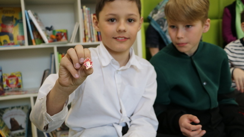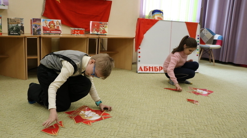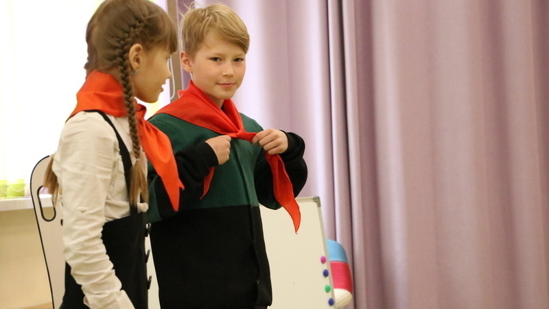 Учащиеся с любопытством рассматривали пионерские атрибуты: красный галстук, значок, горн и барабан, пионерское знамя. Ребята побывали в роли настоящих пионеров, участвуя в конкурсах: «Завяжи пионерский галстук», «Собери пионерский значок», «Составь слова горнист и барабан». Сопровождали «состязания» веселые пионерские песни.