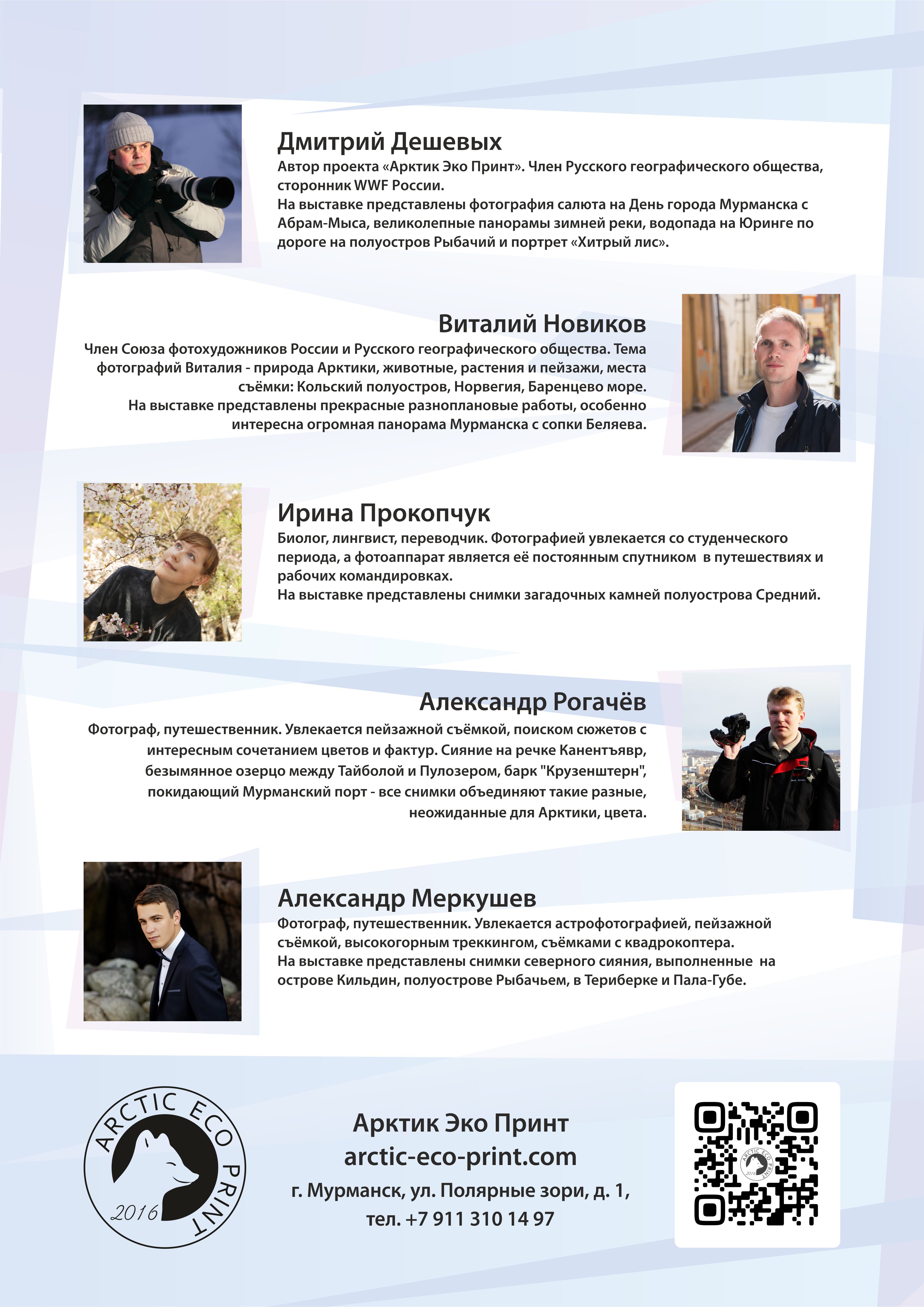 Это подарок для всех мурманчан и гостей города ко дню рождения Мурманской области. Выставка организована в рамках проекта «ARCTIC ECO PRINT». На ней будут представлены несколько десятков снимков на холсте известных фотографов: Дмитрия Дешевых, Виталия Новикова, Ирины Прокопчук и Александра Меркушева.