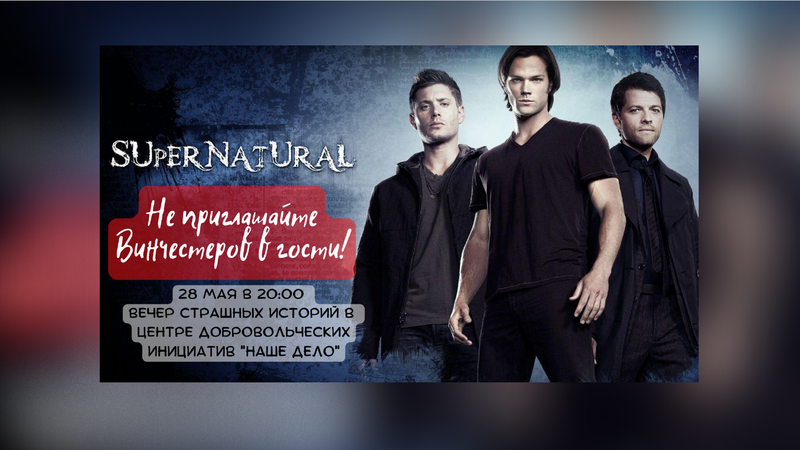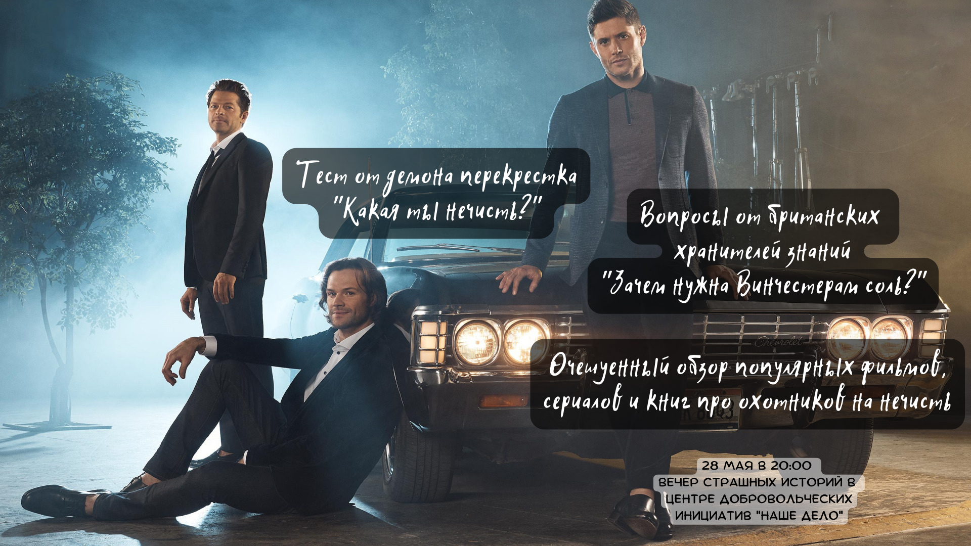 28 мая в 20:00 в центре добровольческих инициатив «Наше дело» вы сможете пройти тест от демона перекрестка «Какая ты нечисть?», ответить на страшные вопросы о сверхъестественных существах от Британских хранителей знаний, познакомится с популярными фильмами, сериалами и книгами про охотников на нечисть.