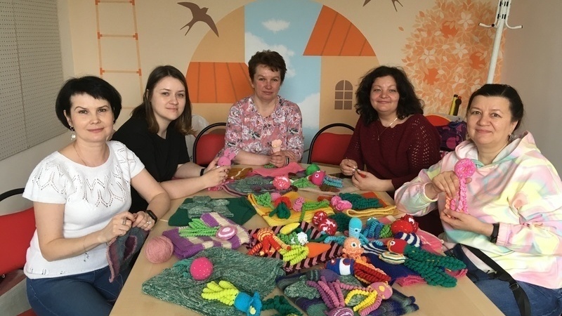 Рукодельницы клуба принесли на встречу игрушки-комфортеры для малышей, которые были связаны в рамках майского марафона «Игрушка для Торопыжки». Вязанные «осьминожки» вошли в жизнь недоношенных малышей во всем мире. Уникальная находка здесь сразу в нескольких качествах такой игрушки. Главное – это спиралевидные завитки-щупальца осьминожки ( или ботвы морковки). Младенцы хватаются за их щупальца, как за пуповину в мамином животе, а значит, перестают выдергивать зонды и системы дыхания, а кроме того, игрушки дают им ощущение комфорта и защищенности.
