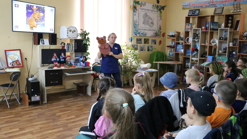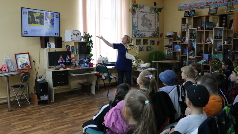 Библиотекарь рассказала ребятам о коренном народе Кольского Севера, о традиционных занятиях народа саами и саамском фольклоре. Школьники узнали многих традиционных героев саамских легенд и сказаний: оленя Мяндаша, медведя Тала, злую колдунью Адзь. Волшебный народец Чахкли был уже знаком ребятам по сказкам, и они с удовольствием поиграли в игру «Поговори с Чахкли».