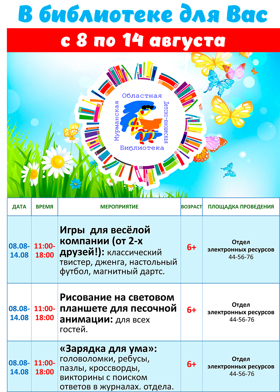 Мурманская областная детско-юношеская библиотека имени В. П. Махаевой приглашает читателей принять участие в летнем фоточеллендже, веселых соревнованиях, экологической викторине, посетить познавательно-развлекательный медиачас.