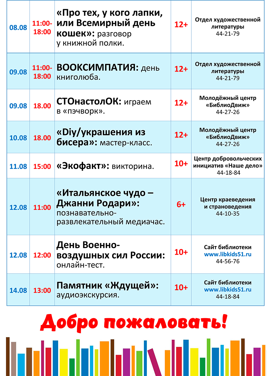 Кроме этого, читатели могут принять участие в Межрегиональном творческом проекте «Традиции живая нить», приуроченном к объявленному в Российской Федерации Году культурного наследия народов России (до 1 ноября 2022 года), в IV Межрегиональном конкурсе «Дневник путешественника», организованный в честь Дня географа (до 17 августа 2022 года), присоединиться к акции в честь Дня полярника «Арктический урок» (до 17 августа 2022 года).