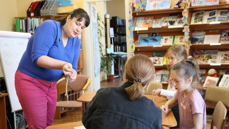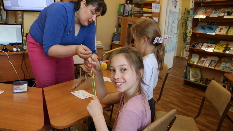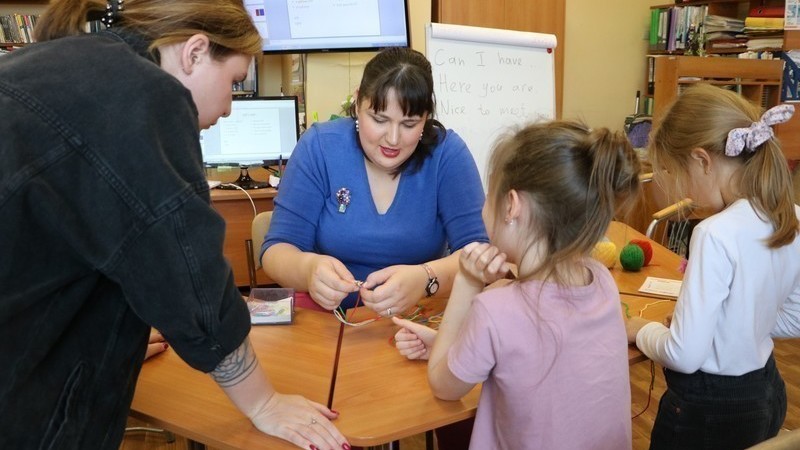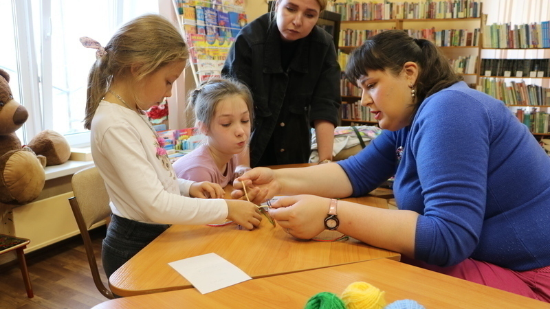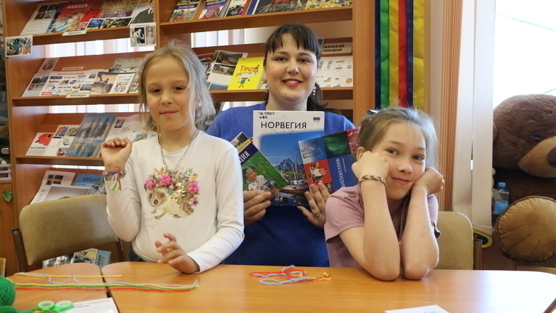 Далее поговорили про саамов, что это за народ, где он живёт, узнали английские названия наших стран-соседей (Финляндии, Норвегии, Швеции), а также какие цвета присутствуют на саамском флаге и что они символизируют. После юные мастерицы стали осваивать технику плетения браслета, в котором четыре цвета нитей, переплетающихся между собой в определённом порядке, соответствуют цветам саамского флага.