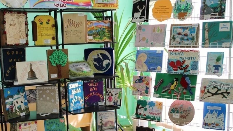 На выставке представлены работы победителей Международного конкурса детской рукописной книги, организатором которого является Мурманская областная детско-юношеская библиотека им. В. П. Махаевой.
