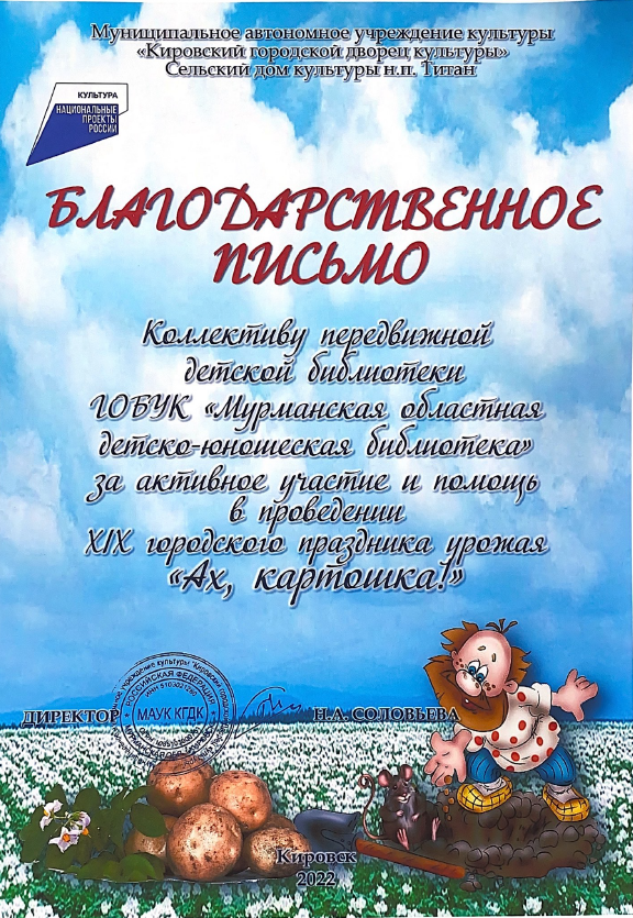 Специалисты Мурманской областной детско-юношеской библиотеки имени В.П. Махаевой постоянные гости городского праздника, и в этот раз они привезли для детворы интерактивную программу «Ах, картошка, объедение!». Погода была благосклонна к северянам: в небе с самого утра светило солнышко.