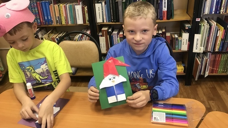 Затем ребята из двух квадратных кусочков цветной бумаги сделали гнома в технике оригами, и оформили открытку, которую украсили по своему желанию.