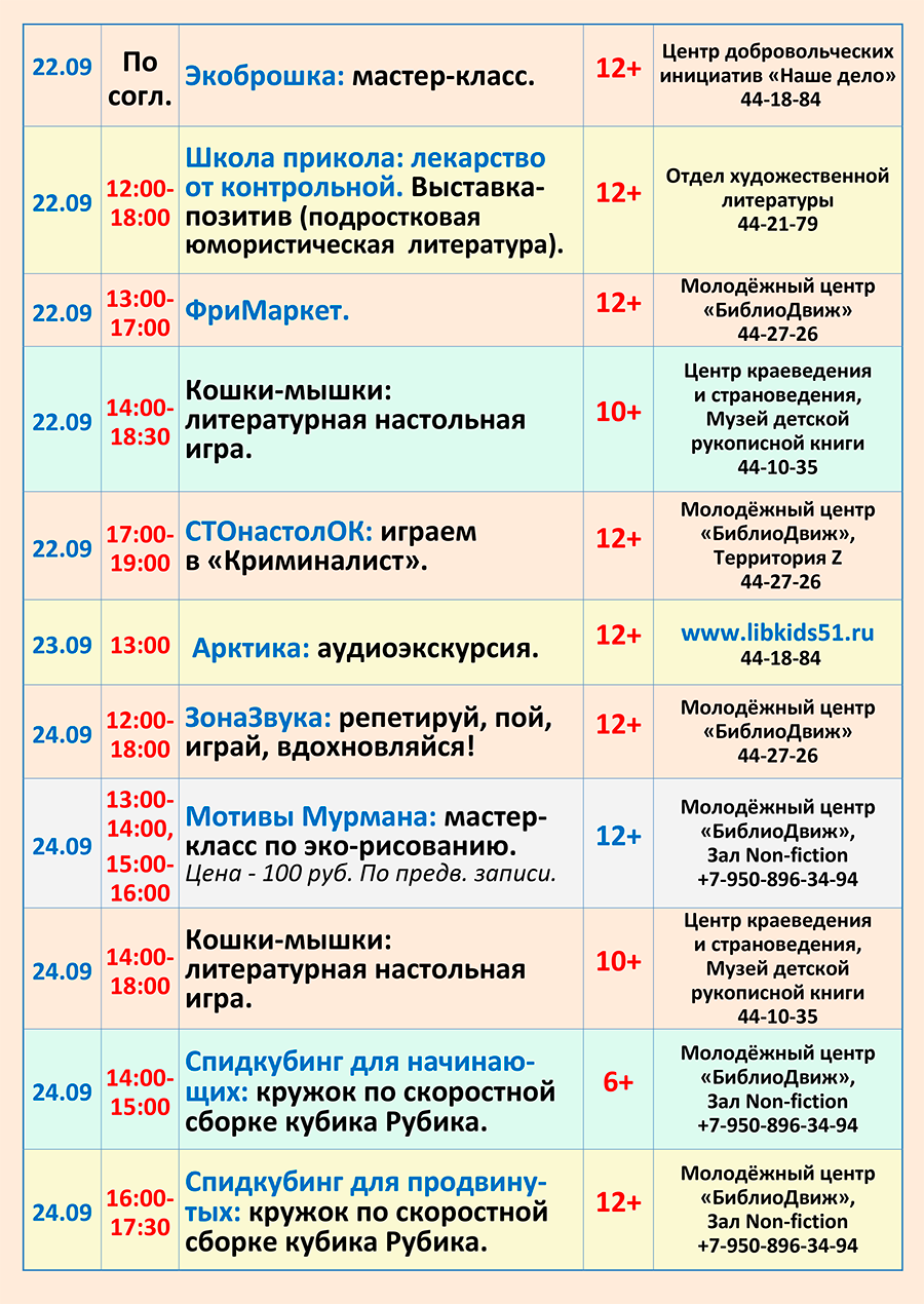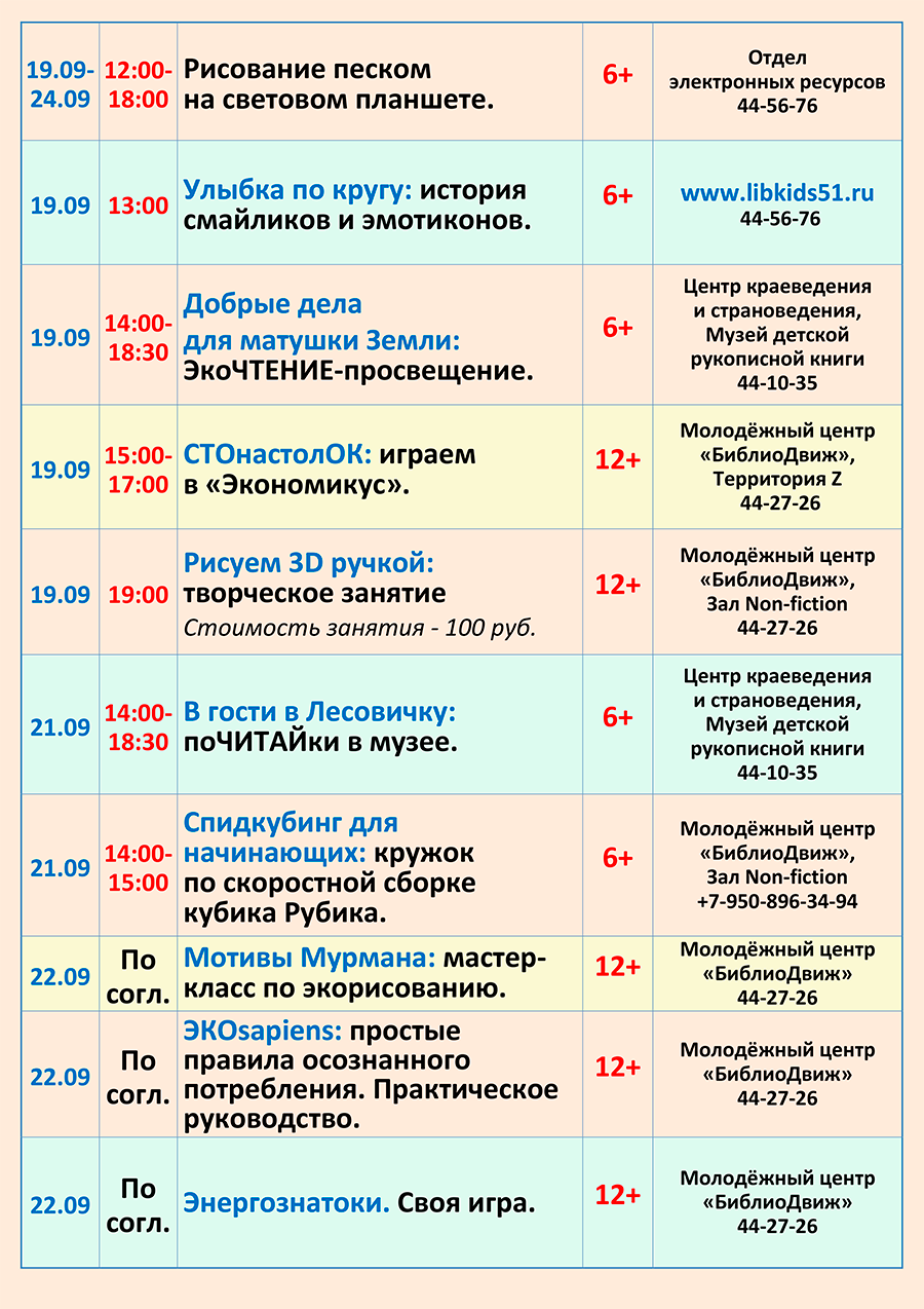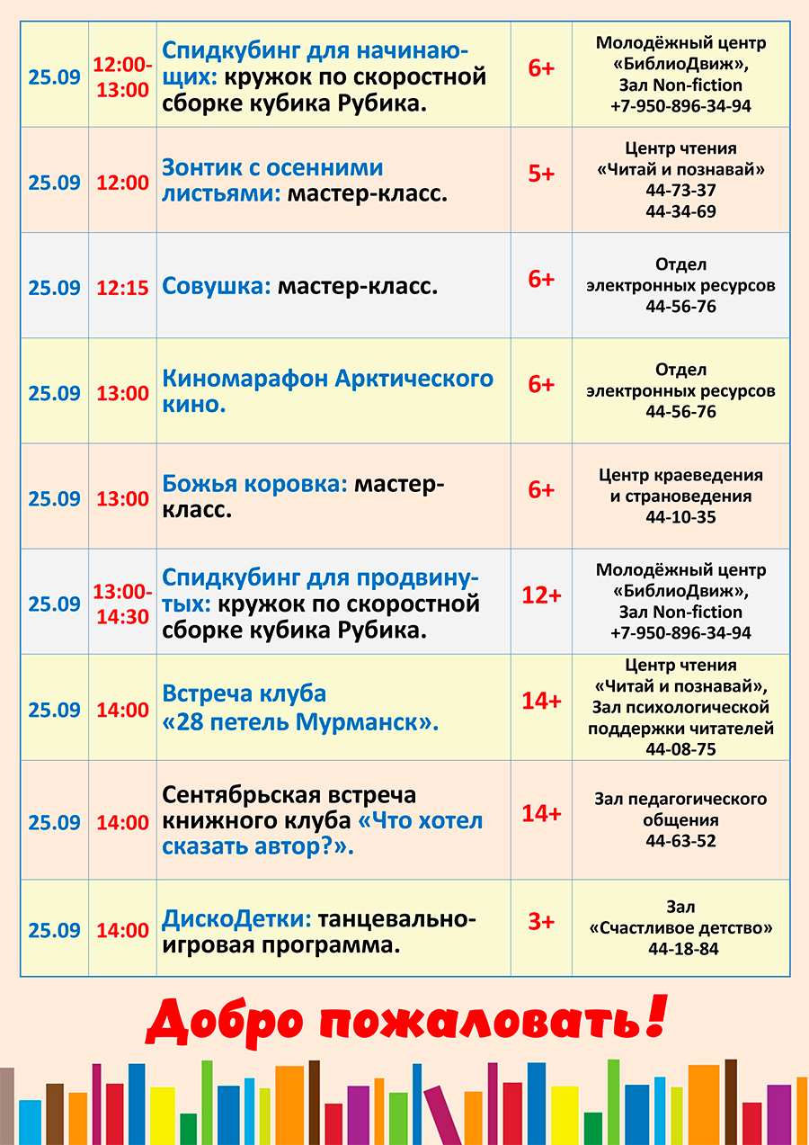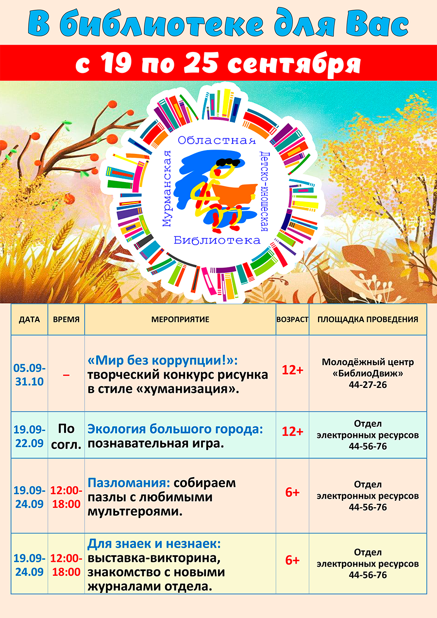 Уважаемые посетители, знакомьтесь с программой мероприятий, которые пройдут в библиотеке с 19 по 25 сентября