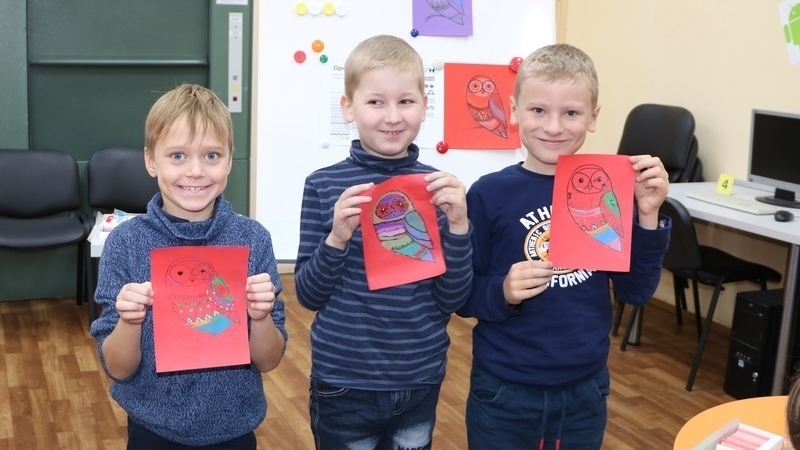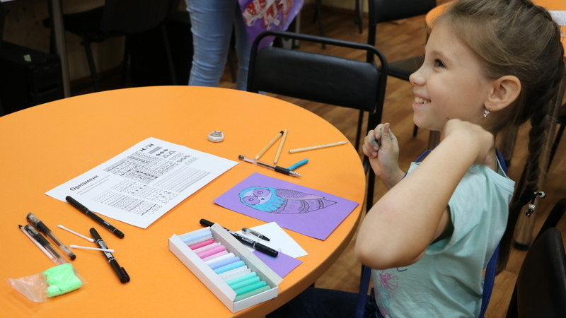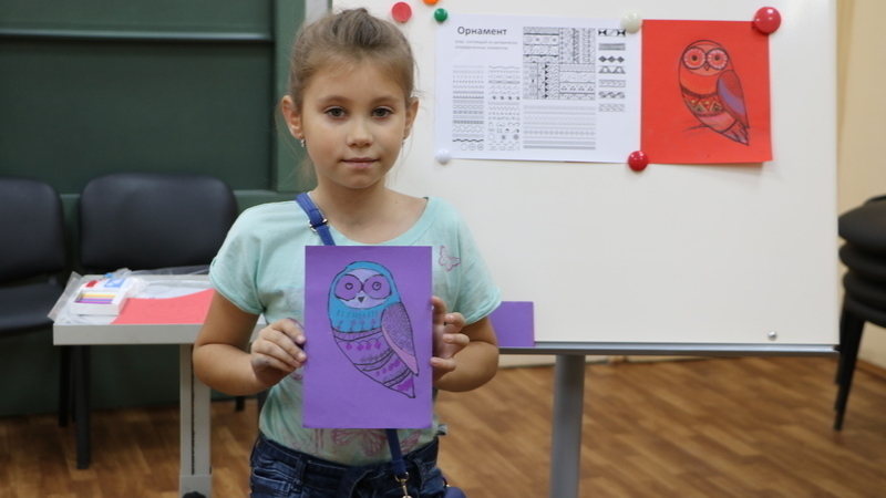 На мастер-классе «Совушка» веселой компанией ребята дружно знакомились с тем, что такое орнамент, рисовали и разукрашивали пернатых красавиц, а заодно и себя в самые разные цвета сухой пастели.