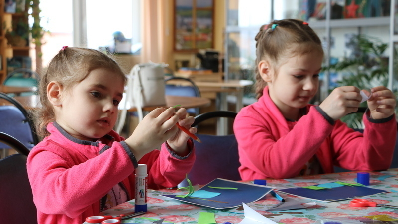 На творческом занятии мы будем учиться вырезать из цветной бумаги, клеить, складывать в гармошку и оформлять нашу морошку на зеленом листке.