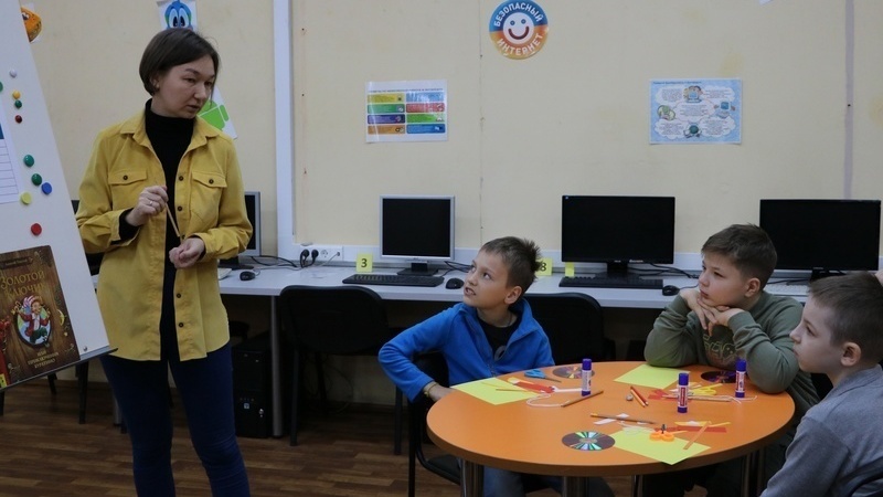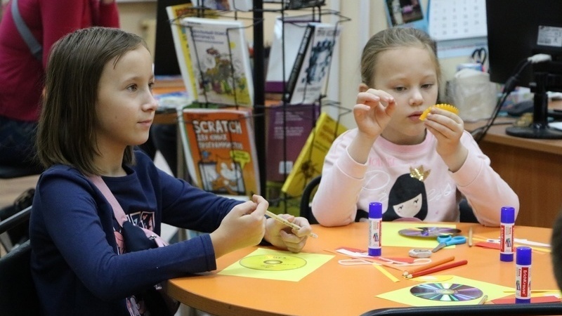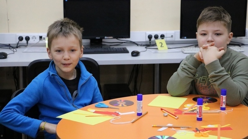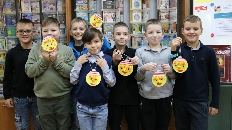 Творческое занятие получилось очень насыщенным. Участники мероприятия узнали, чем отличается «Золотой ключик, или приключения Буратино» Алексея Толстого от «Приключений Пиноккио» Карло Каллоди. Ребята отгадали персонажей знаменитой киносказки по их песням и, конечно, смастерили главного героя из цветной бумаги и CD-диска.
