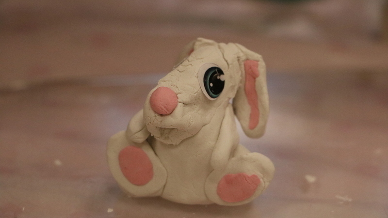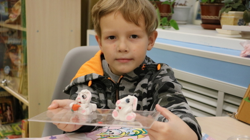 На первом занятии юные скульпторы слепили из пластилина фигурку кота Семена. А сегодня они познакомились с новым материалом – с большим энтузиазмом осваивали лепку из полимерной глины. Моделью для ребят послужили зайчата из детских книг. Читатели рассматривали иллюстрации, знакомились с историями книжных ушастиков. Узнали, что цвет глаз и форма ушей у разных животных различаются. Используя эти знания, юные скульпторы сделали из полимерной глины своего зайку, а потом раскрасили его.