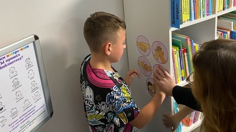 При входе в зал детей ожидало нововведение в виде приветственных карточек, из которых ребята могли выбрать, как поздороваться с библиотекарем: пожать руку, «дать пять», поздороваться кулачками, помахать и обнять!