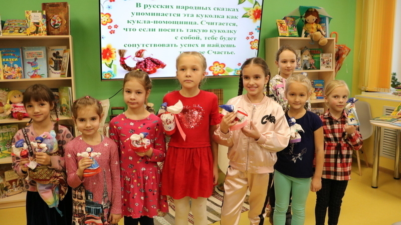 Затем ребята под руководством сотрудника отдела сделали свою первую тряпичную куклу-оберег. Для работы им потребовались лоскуты белой и цветной ткани и нитки, полученные знания и хорошее настроение. Без иголок и ножниц у ребят получились замечательные куклы, которых они дружно наряжали, плели косы, украшали яркими лентами. Работать было очень не просто, но увлекательно. Каждая куколка получилась неповторимой. Теперь у ребят есть своя куколка на счастье – помощница.