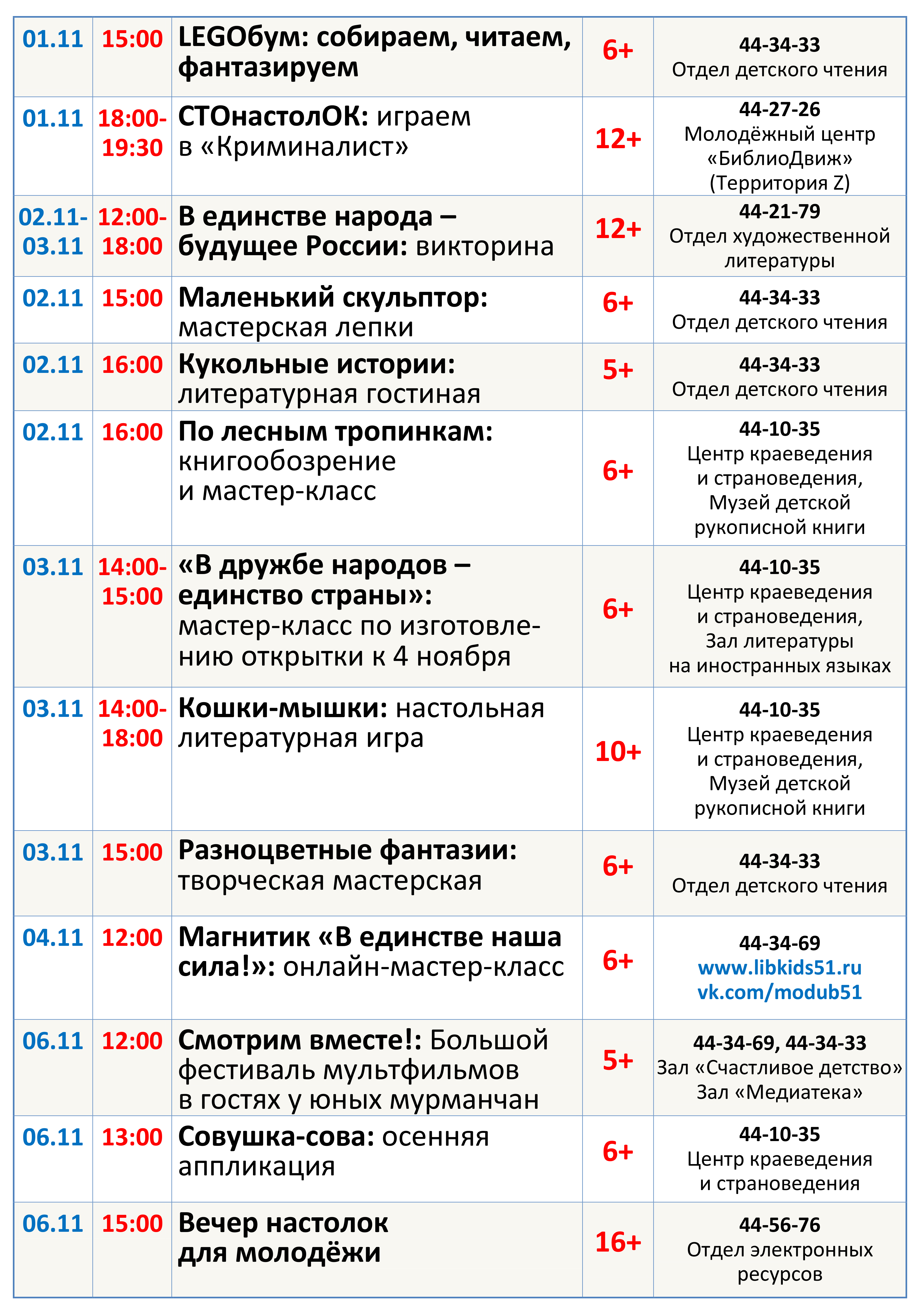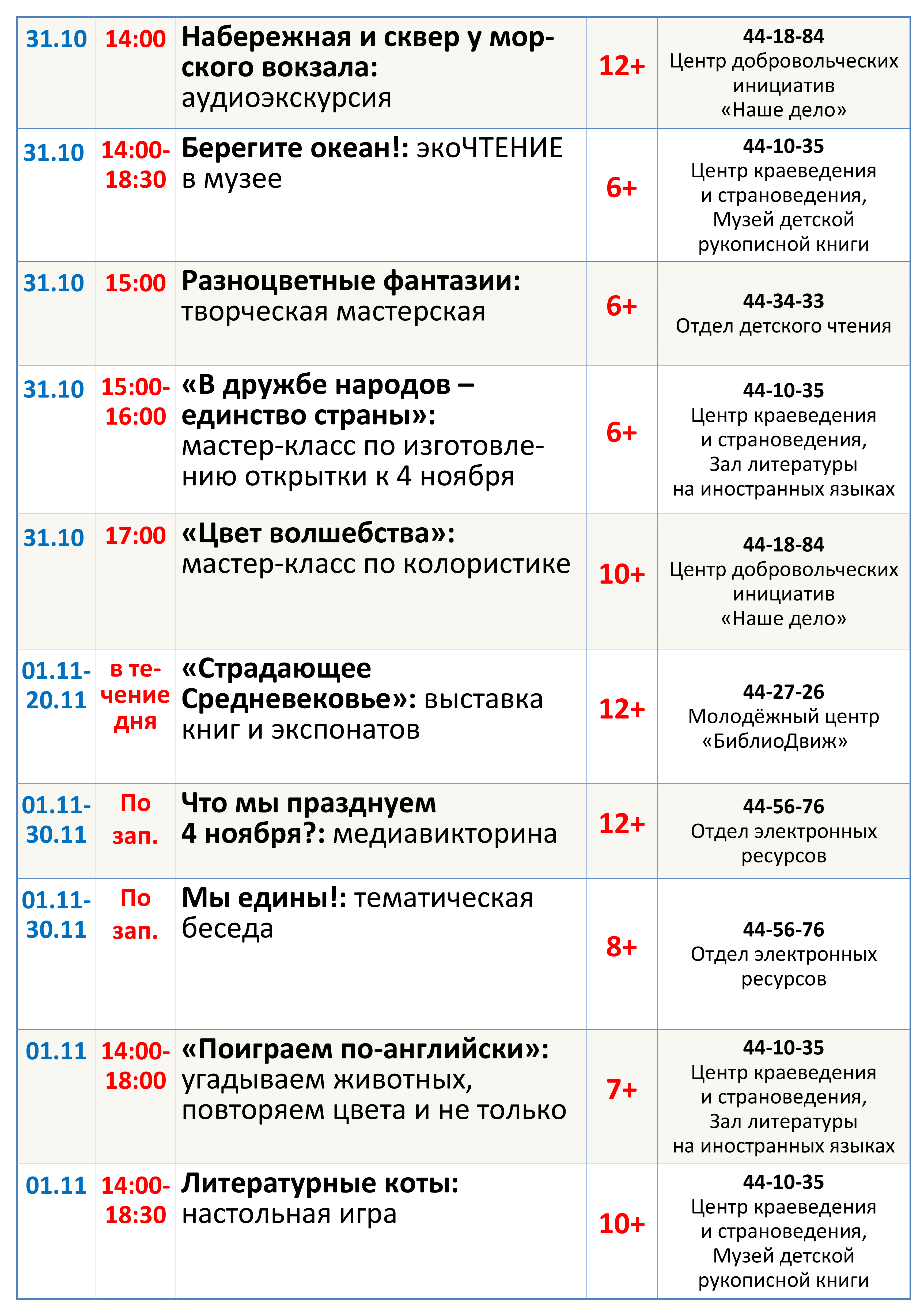 Уважаемые посетители, знакомьтесь с программой мероприятий, которые пройдут в библиотеке с 31 октября по 06 ноября