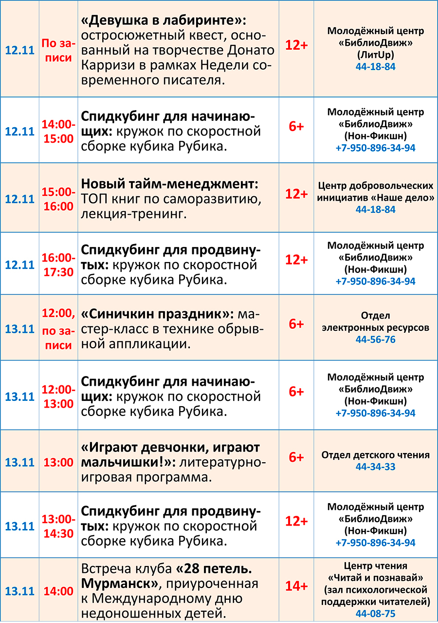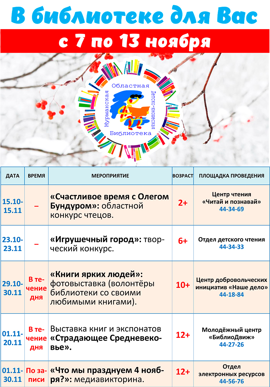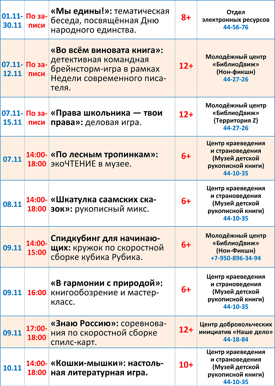 Уважаемые посетители, знакомьтесь с программой мероприятий, которые пройдут в библиотеке с 7 по 13 ноября