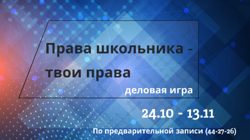 Молодежный центр «БиблиоДвиж» приглашает учащихся 5-9 классов на деловую игру «Права школьника – твои права». Мероприятие проводится по 13 ноября