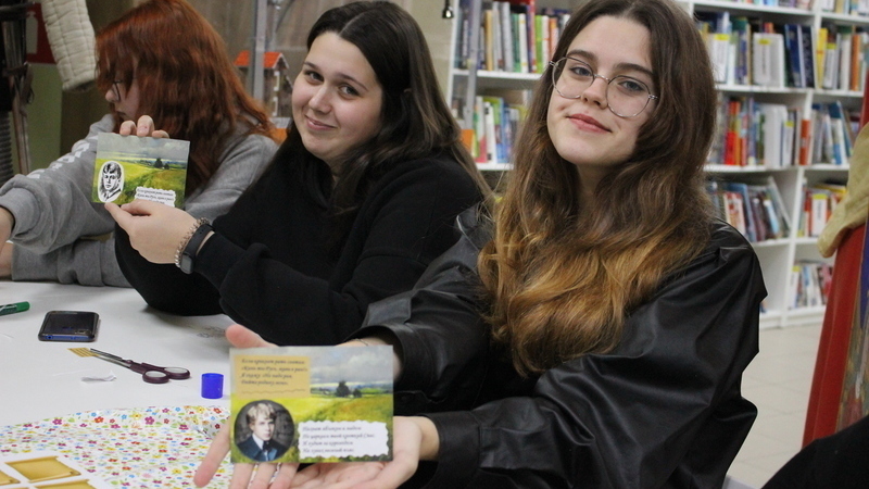 После студенты заглянули в свободную мастерскую. Применив творческий подход и нестандартное мышление, ребята сделали прекрасные закладки и открытки с изображением Сергея Александровича.
