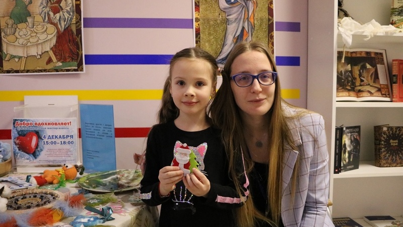В холле цокольного этажа была организована благотворительная ярмарка рукодельных работ. Посетители с радостью приобретали брошки из эпоксидной смолы, новогодние украшения на ёлку и вязаные игрушки. Все работы были созданы и предоставлены на ярмарку сотрудниками волонтерского центра библиотеки.