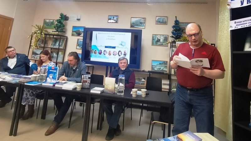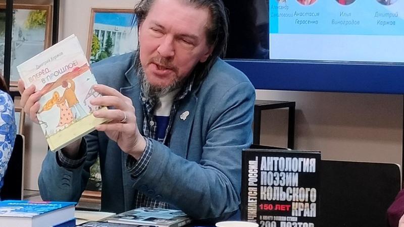 Дмитрий Коржов рассказал о своих книгах «Мурманцы» и «Вперёд, в прошлое», представил художественный альманах «Капитан Грэй (Площадь первоучителей)», выпущенный по результатам XII одноименного форума-фестиваля «Капитан Грэй», прочитал стихотворение Николая Колычева.