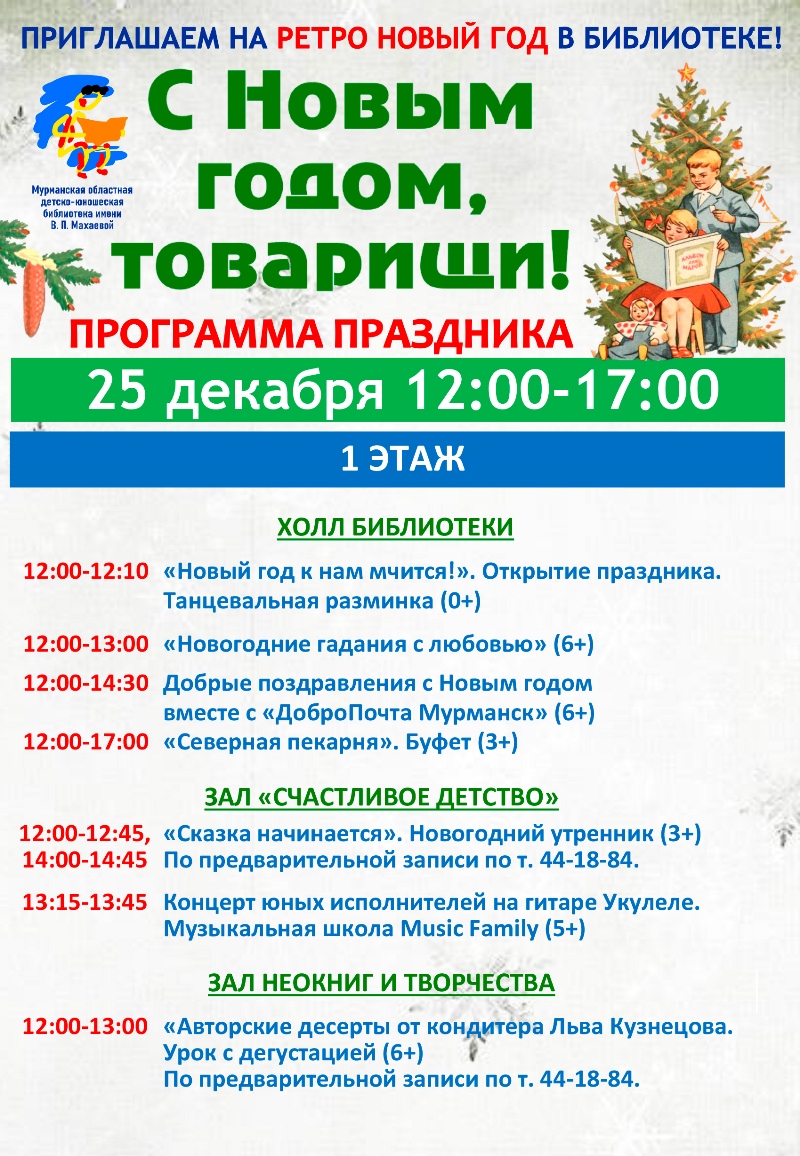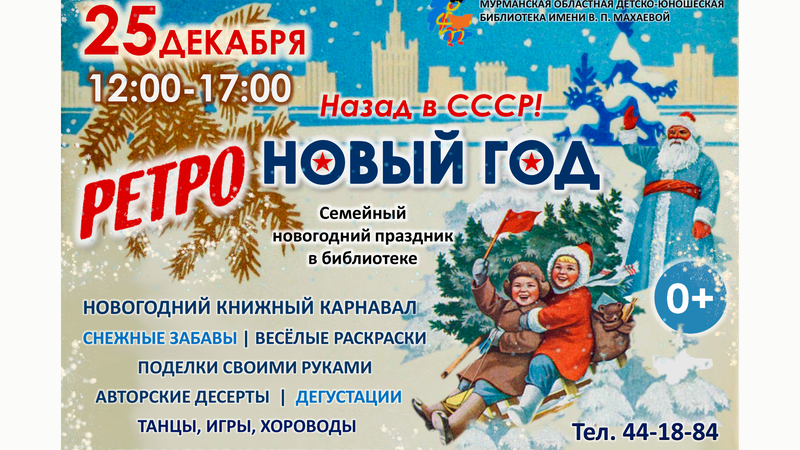 Вместе перенесемся в эпоху СССР, немного поностальгируем и получим заряд веселья, бодрости и хорошего настроения. Специально в этот день вас ждут многочисленные творческие мастерские, на которых вы создадите новогодние поделки своими руками, игровые программы и театрализации, выступление юных музыкантов, урок от кондитера-профессионала, танцы, игры, хороводы, пение хором. Всех гостей праздника ждет сюрприз от библиотекарей – полное погружение в советскую эпоху.