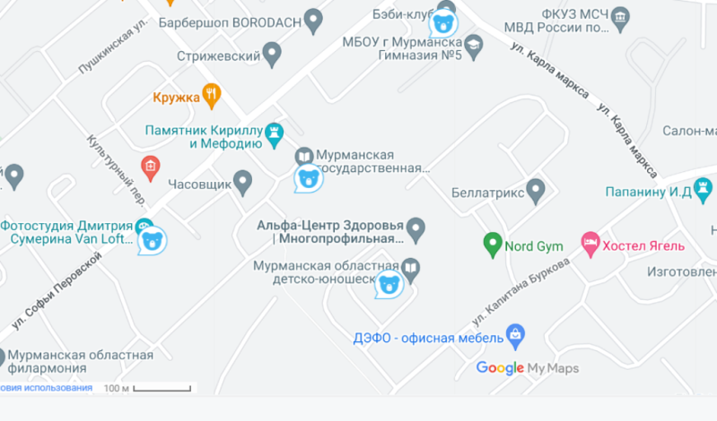 Мурманскую областную детско-юношескую библиотеку имени В. П. Махаевой можно найти на дружелюбной карте на сайте Kid-friendly, а на её дверях красуется синий мишка!