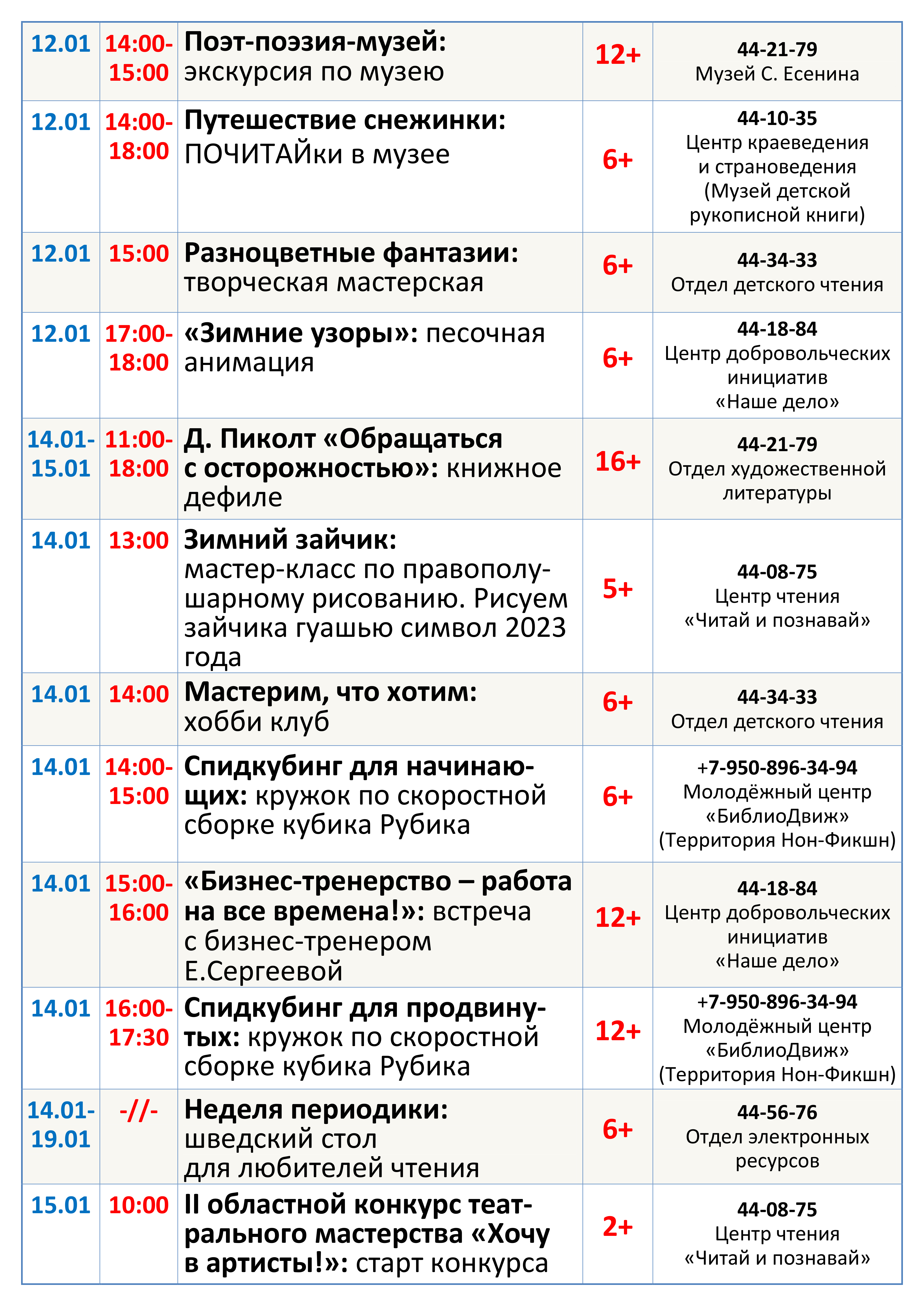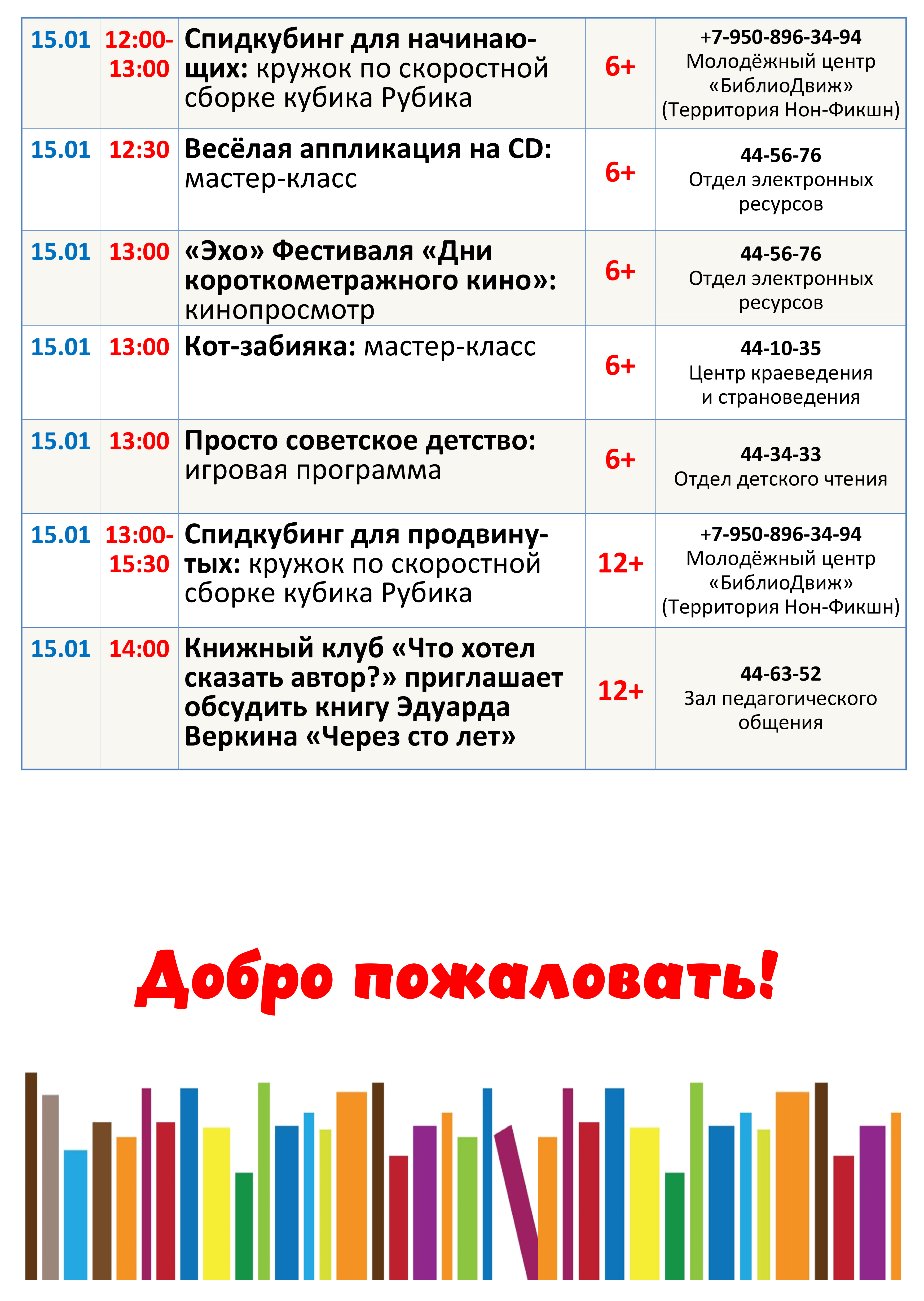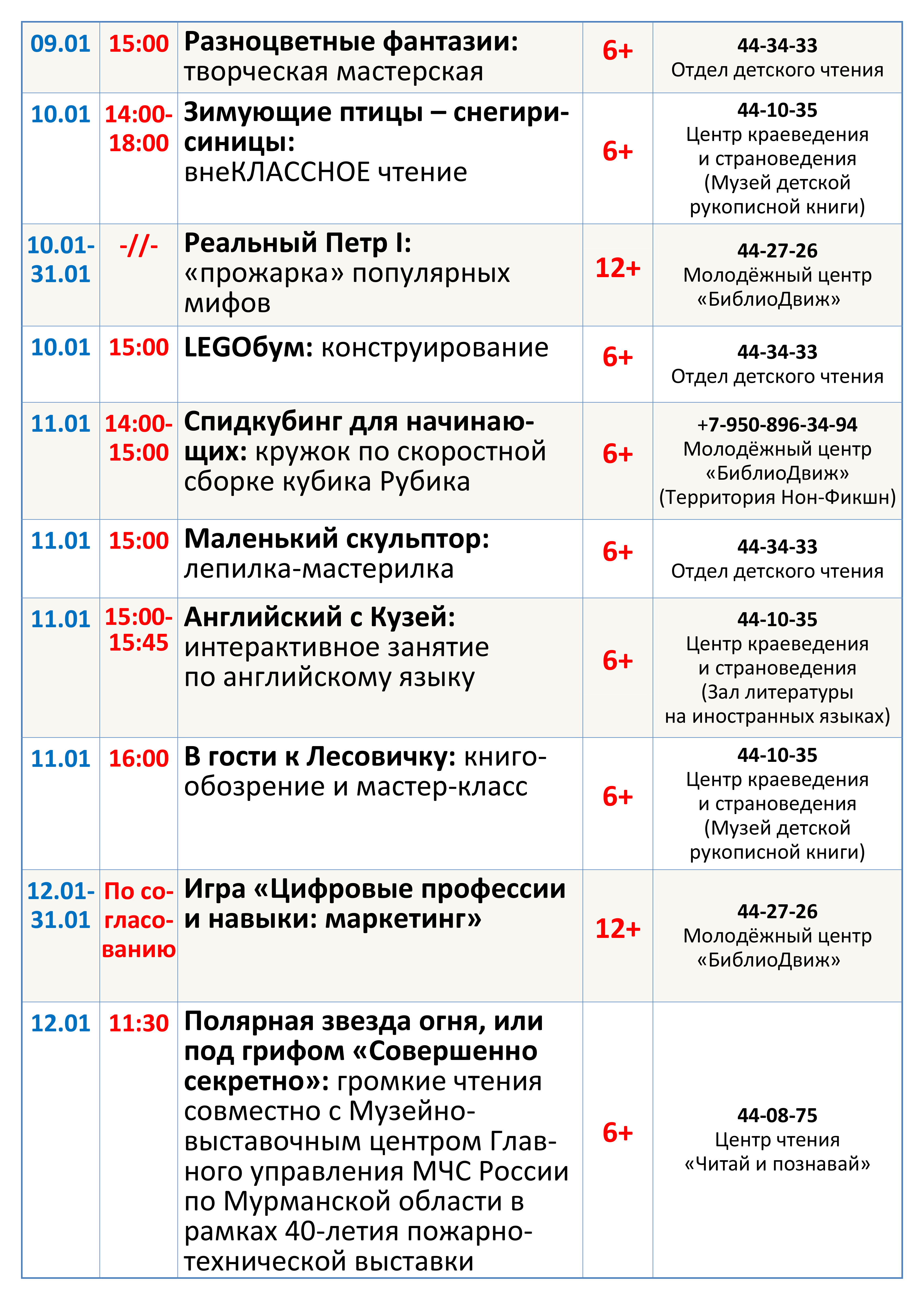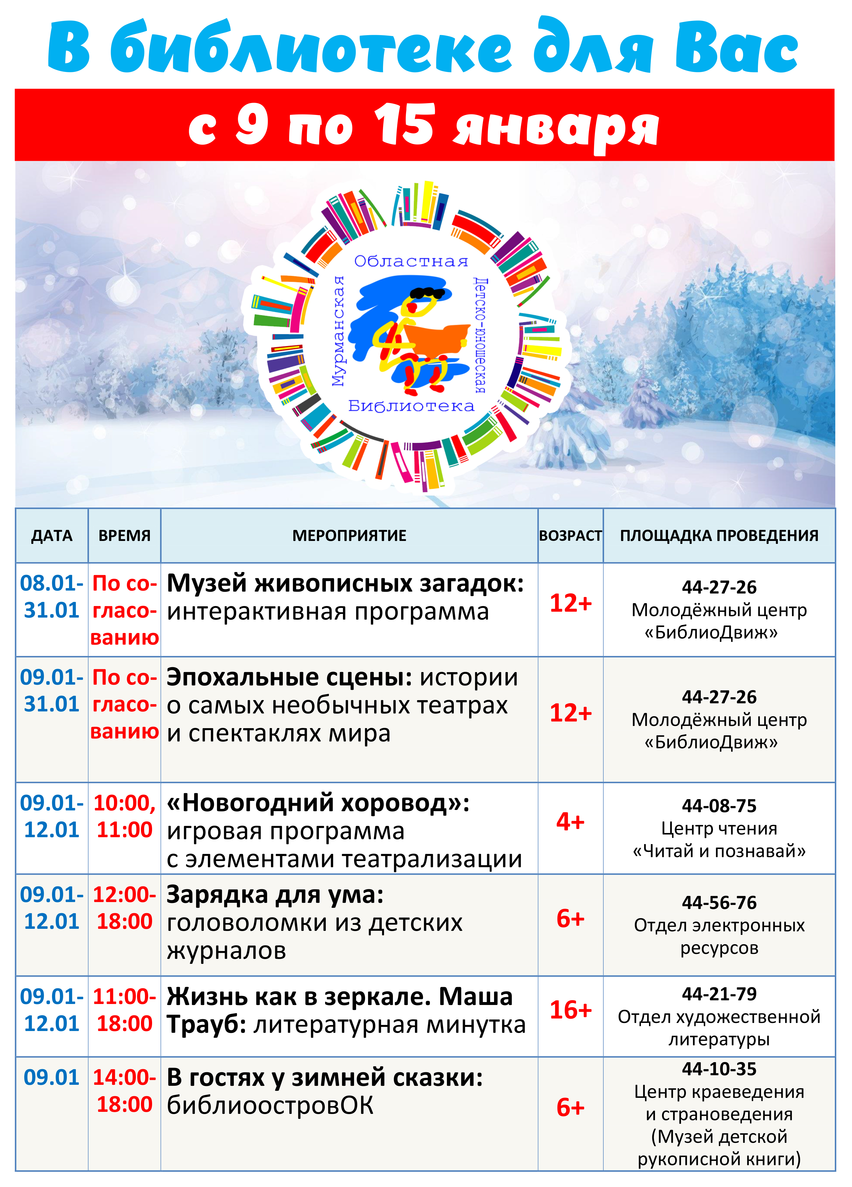 Уважаемые посетители, знакомьтесь с программой мероприятий, которые пройдут в библиотеке с 09 по 15 января