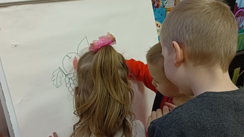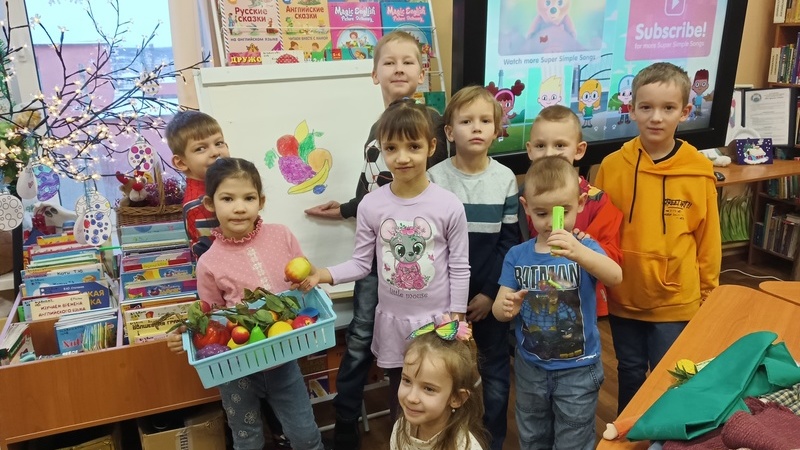 Сегодня ребята, участники клуба «Детский английский», встретились, чтобы послушать сказку на английском языке «Бабочка Алина и её картина» и помочь бабочке Алине раскрасить её «фруктовый букет» – ведь ребята уже знают названия фруктов, изображенных на картине, и 10 цветов