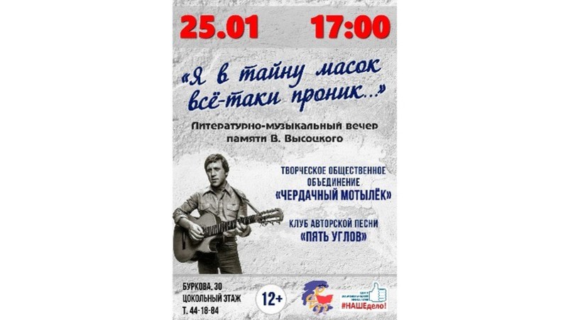 В уютной ламповой атмосфере гостей события ждет встреча с увлеченными людьми – участниками клуба авторской песни «Пять углов», которые исполнят песни Высоцкого. Поэтическую часть встречи представят участники общественного объединения «Чердачный мотылек», сотрудники и волонтеры библиотеки.