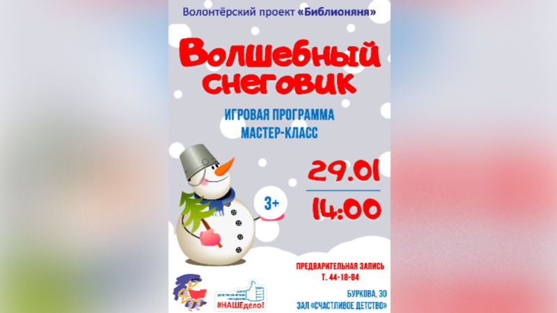 Для гостей пройдет встреча с элементами игры и мастер-класс по созданию снеговика из ватных дисков. Зимняя поделка поднимет настроение участникам и станет хорошим подарком для родных и близких ребят.