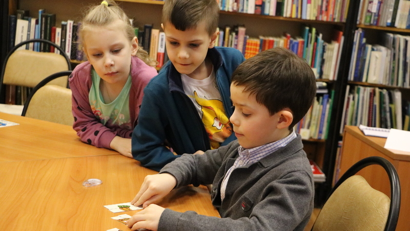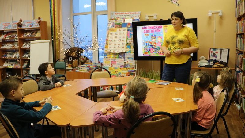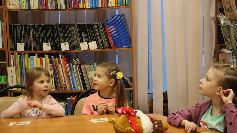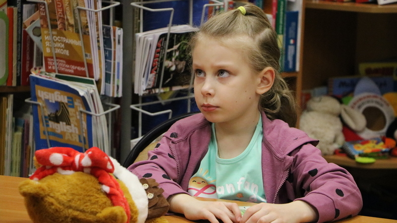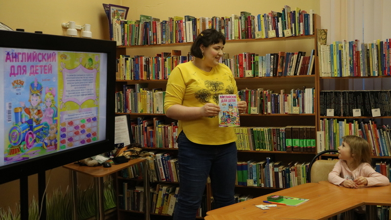 Традиционно за основу занятия Ольга Александровна Дерябина, библиотекарь зала иностранной литературы, взяла один из номеров журнала «КУЗЯ. На английском». В этот раз в центре внимания оказался номер, посвящённый теме детских игрушек. Ребята узнали названия разных игрушек и игр на английском таких, как bear, plane, chess и др.