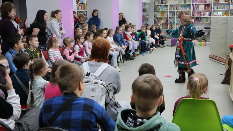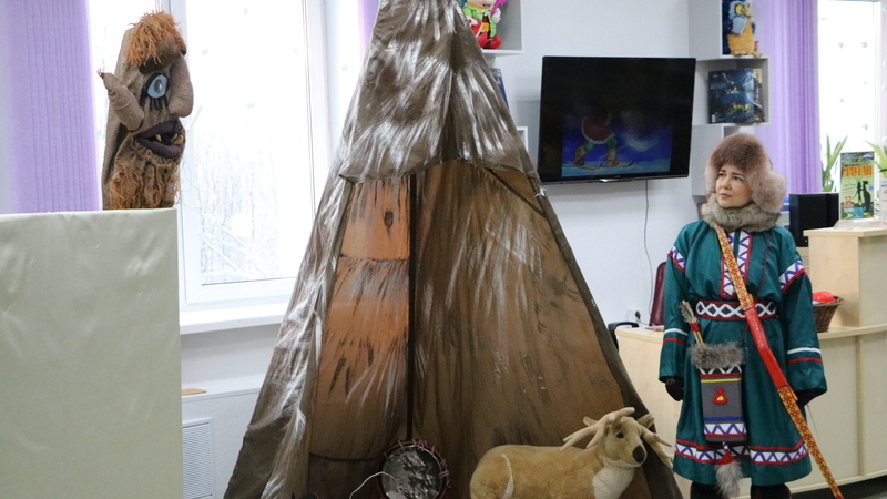 Сегодня зал мир необыкновенных книг и творчества превратился в страну Лапландию, там обитает грозный великан Хийси и живет отважный и любопытный мальчик по имени Сампо.