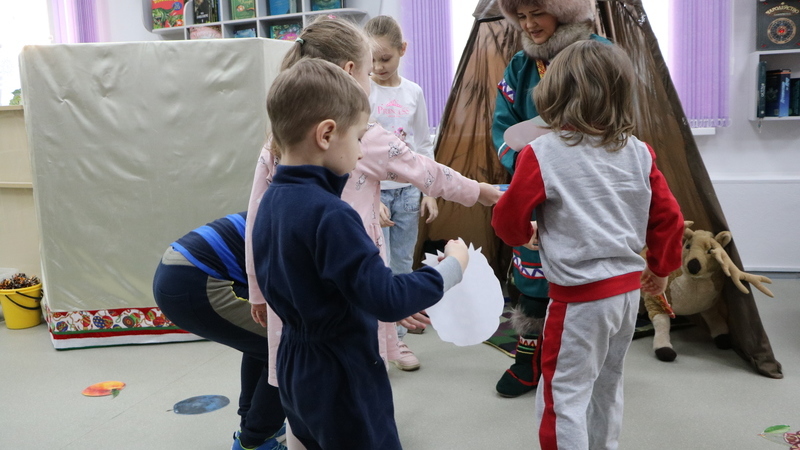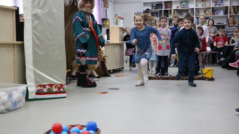 Началось представление с прочтения отрывка из сказки финского писателя «Сампо-Лопаренок». А затем неожиданно появился и сам главный герой произведения вместе с горным королем Хийси, который давал веселому мальчишке всевозможными заданиями. Детвора помогла лопаренку пройти все «испытания»: отгадать загадки, насобирать северных ягод, посбивать снежками все преграды, наловить рыбы.