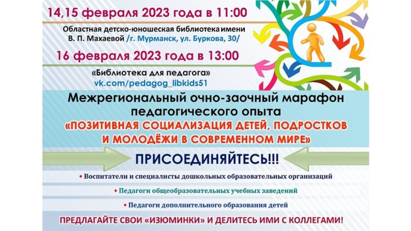 Очно – 14, 15 февраля. Начало марафона в 11:00. В заочной форме марафон начнет работу 16 февраля в социальной сети «ВКонтакте» в группе «Библиотека для педагога». Начало марафона в 13.00 часов.