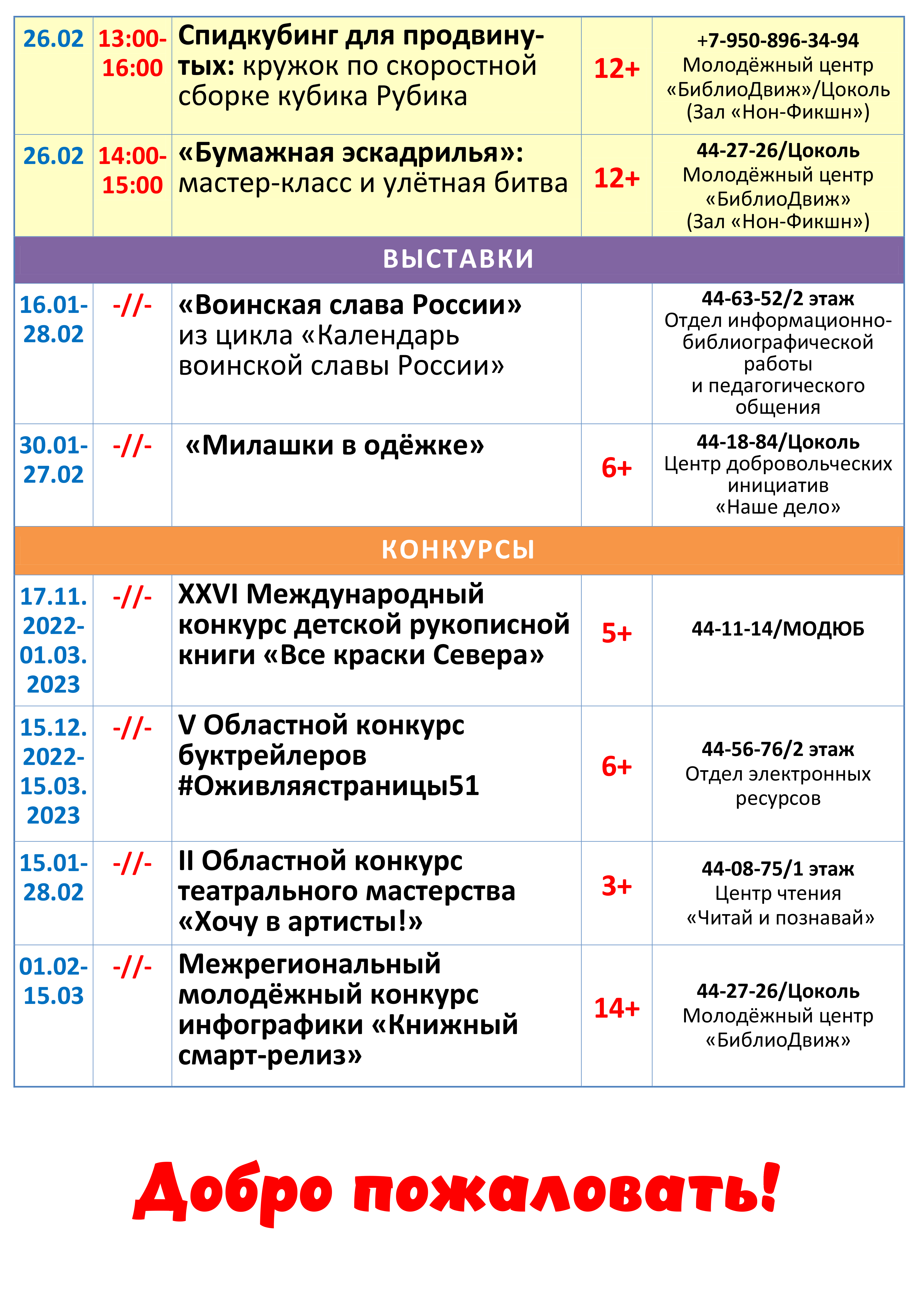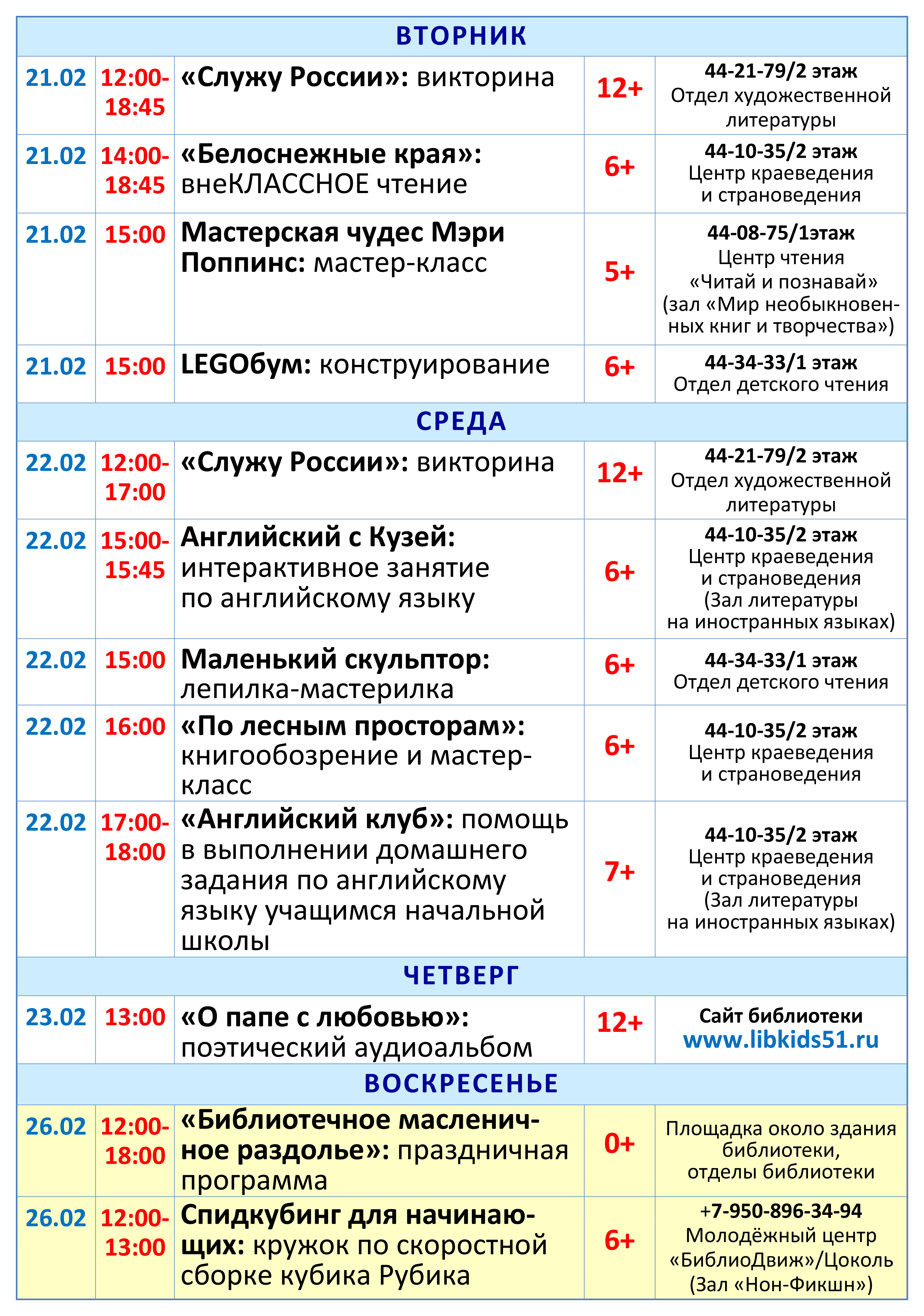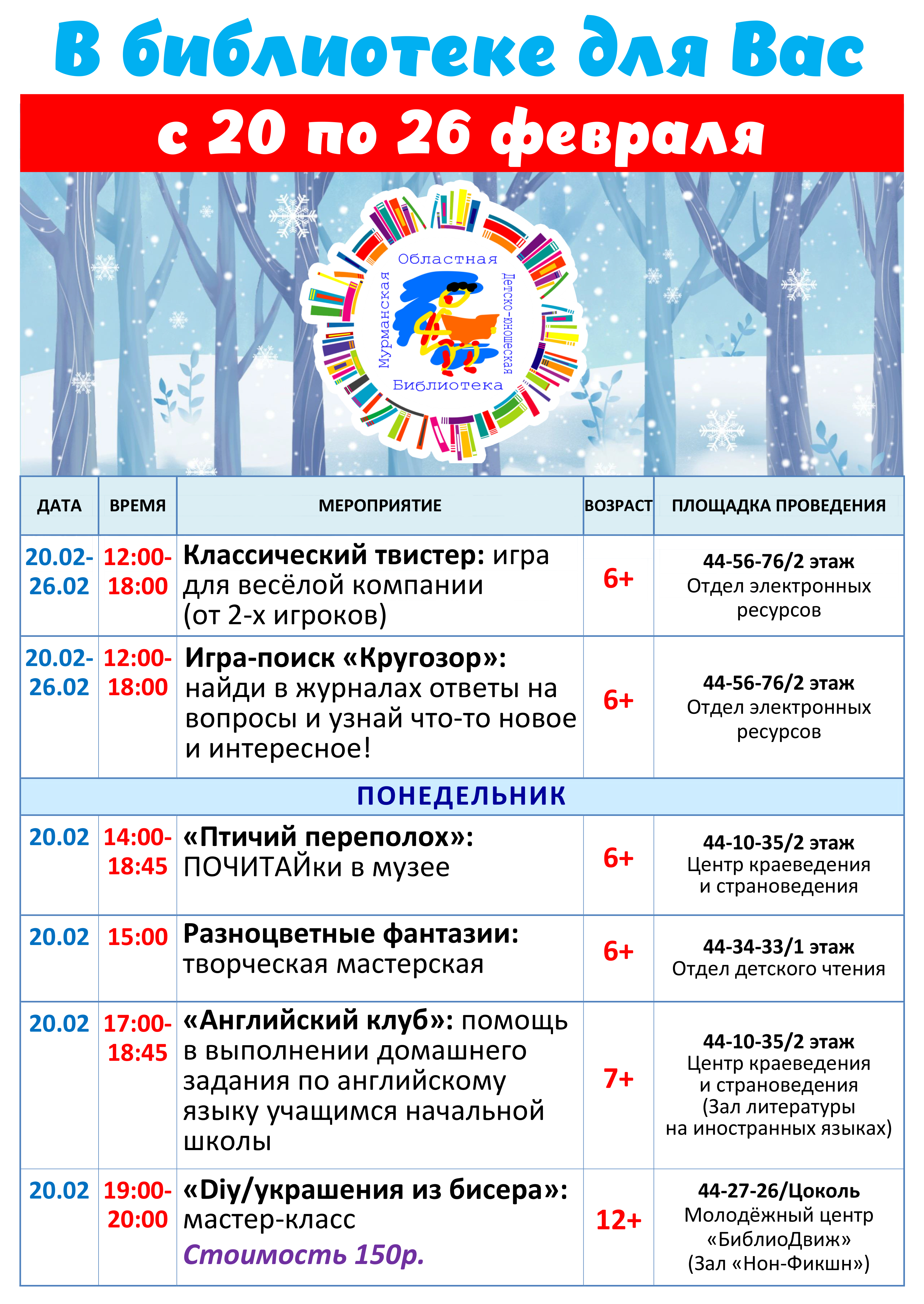 Уважаемые посетители, знакомьтесь с программой мероприятий, которые пройдут в библиотеке с 20 по 26 февраля