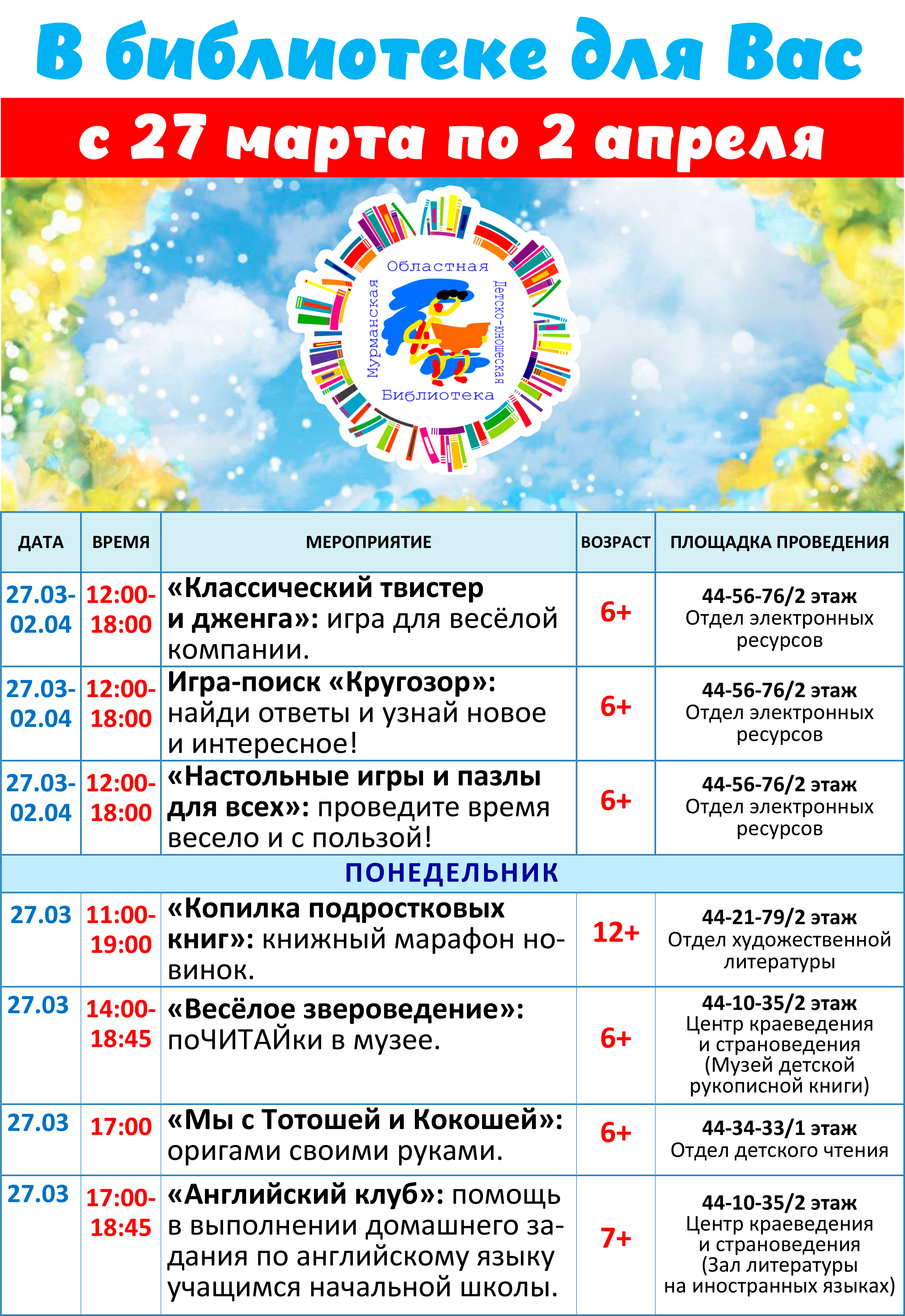 Уважаемые посетители, знакомьтесь с программой мероприятий, которые пройдут в библиотеке с 27 по 02 апреля