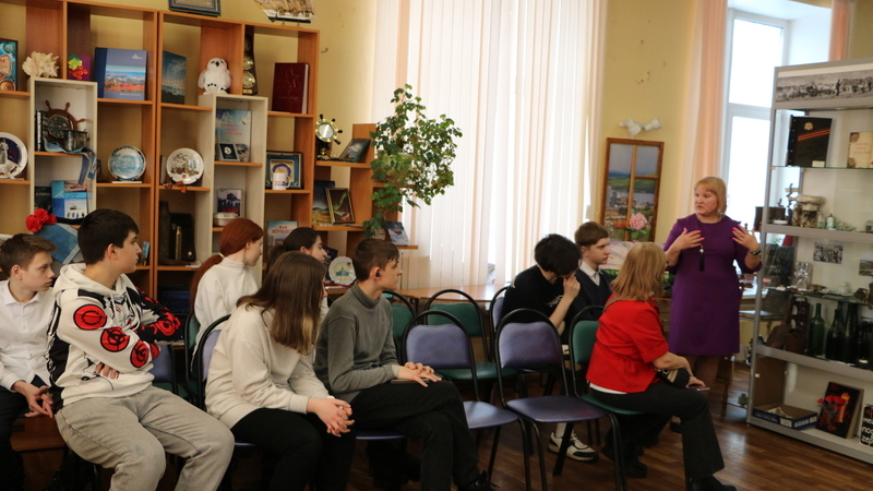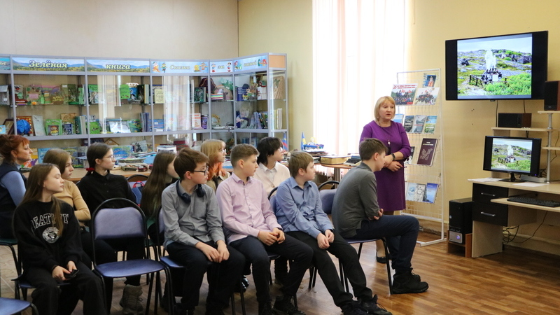 Коновалова Людмила Григорьевна рассказала юнармейцам о военных действиях 1941-1944 годах на Кольском полуострове, о сложнейших условиях, в которых солдатам приходилось добывать Победу. Ребята узнали об организаторе поискового движения в Заполярье Льве Журине, вспомнили известного писателя-краеведа Михаилу Орешету. Библиотекарь представила книги Михаила Григорьевича.