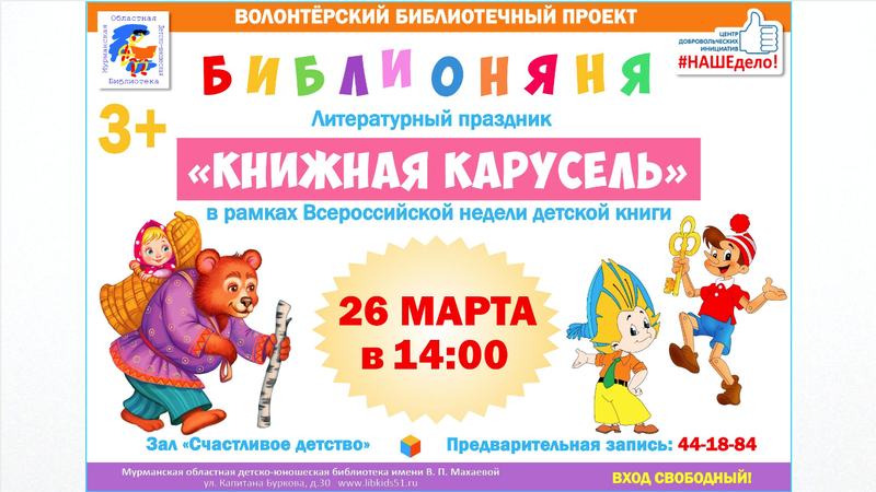 Он пройдет в рамках волонтерского библиотечного проекта «Библионяня» и будет посвящен 80-летию Недели детской книги. На встречу с детьми придут герои русских сказок и любимых детских книг.