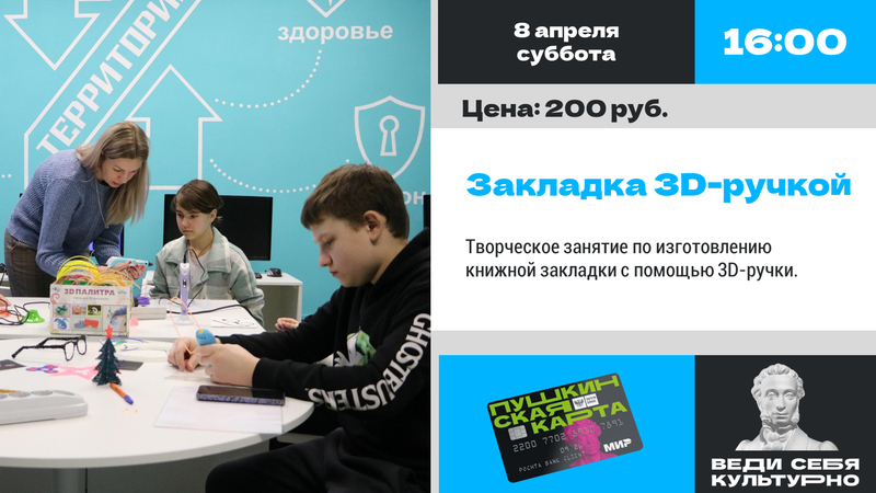 Этот инструмент позволяет создавать различные предметы, фигуры, узоры. Оригинальная закладка всегда будет в центре внимания и точно не даст потерять нужное место в книге. Участники под руководством библиотекаря смогут развить творческие способности и освоить увлекательное 3D-моделирование. Предоставляется полная свобода художественного самовыражения, где нет границ фантазии.