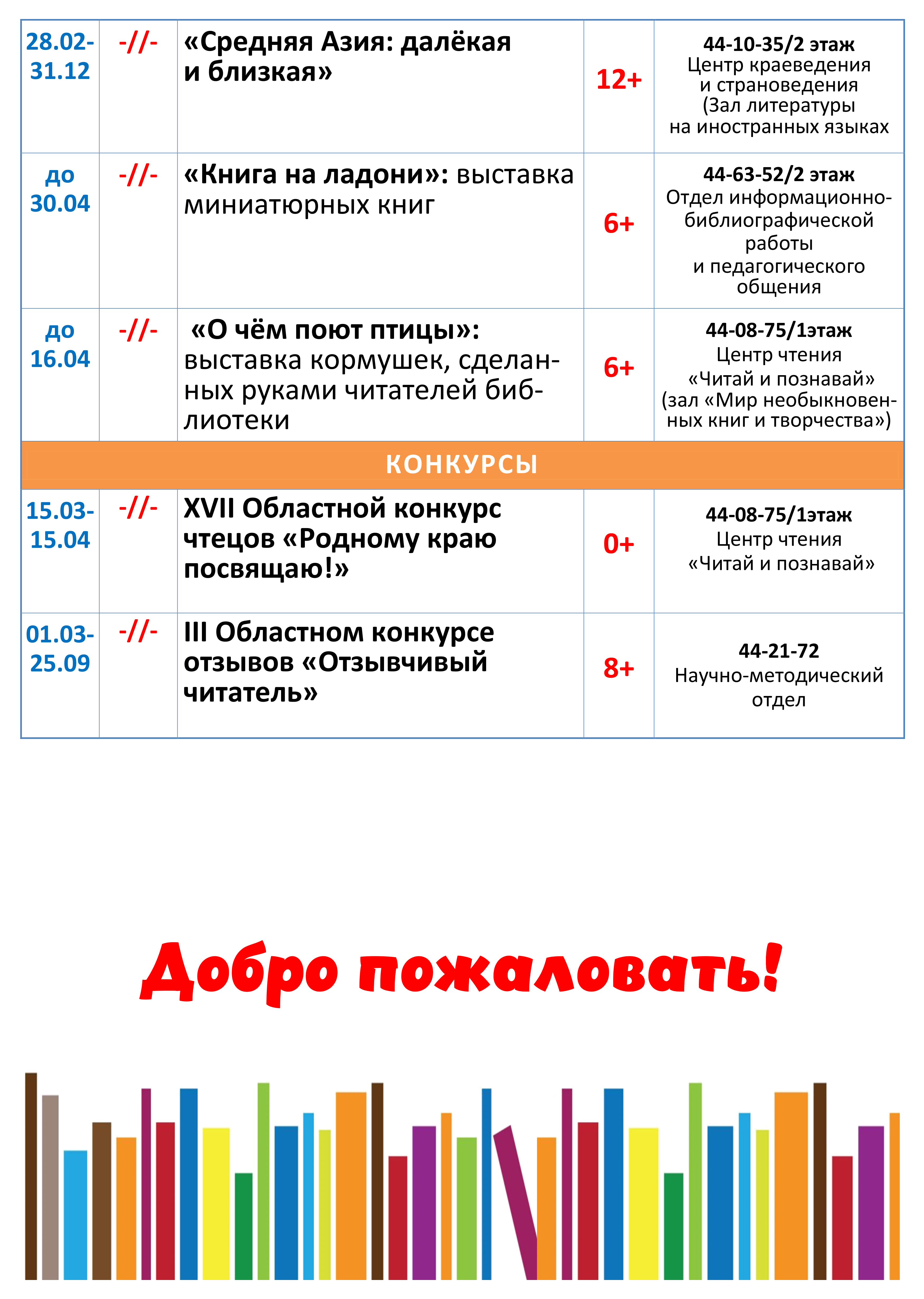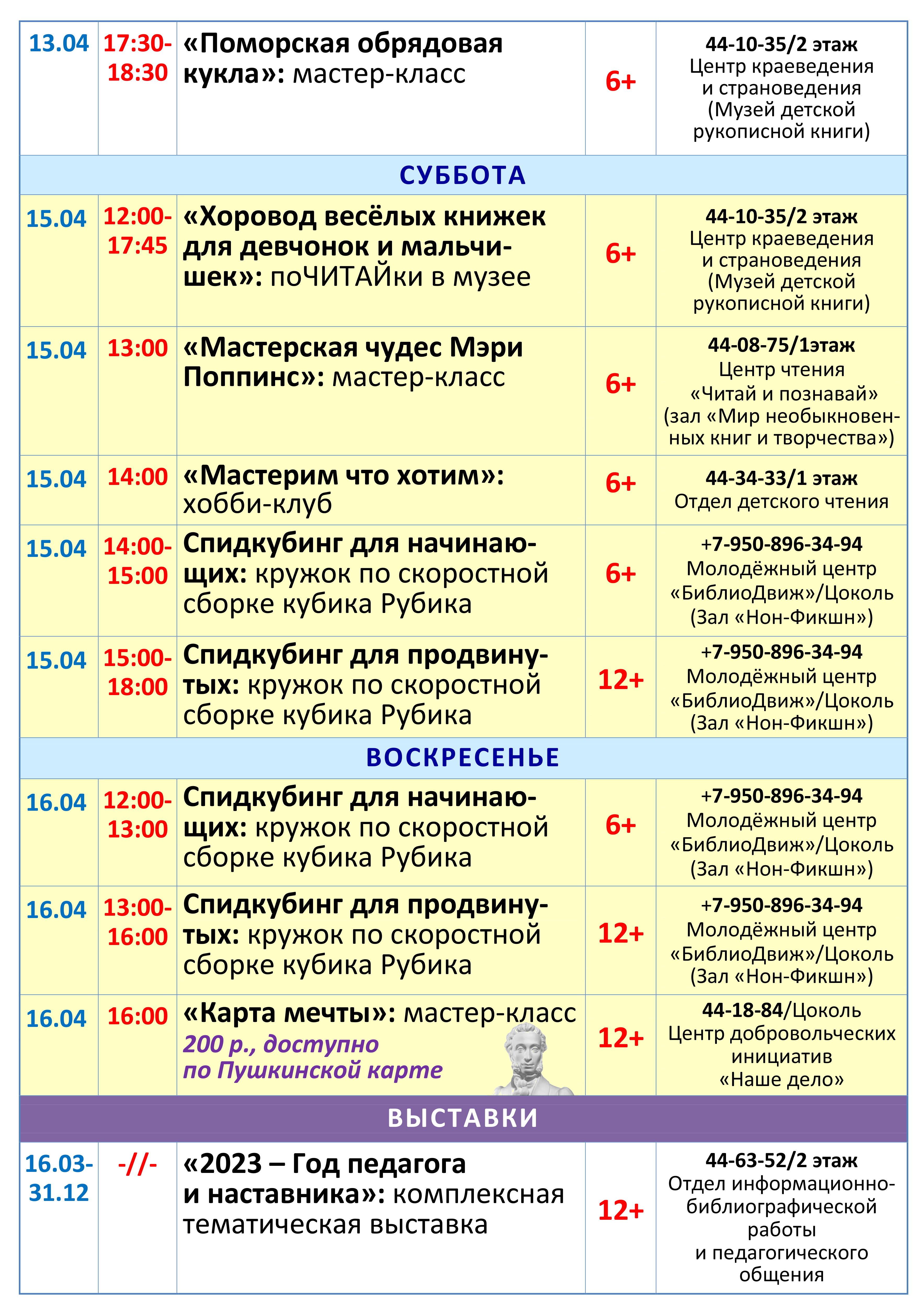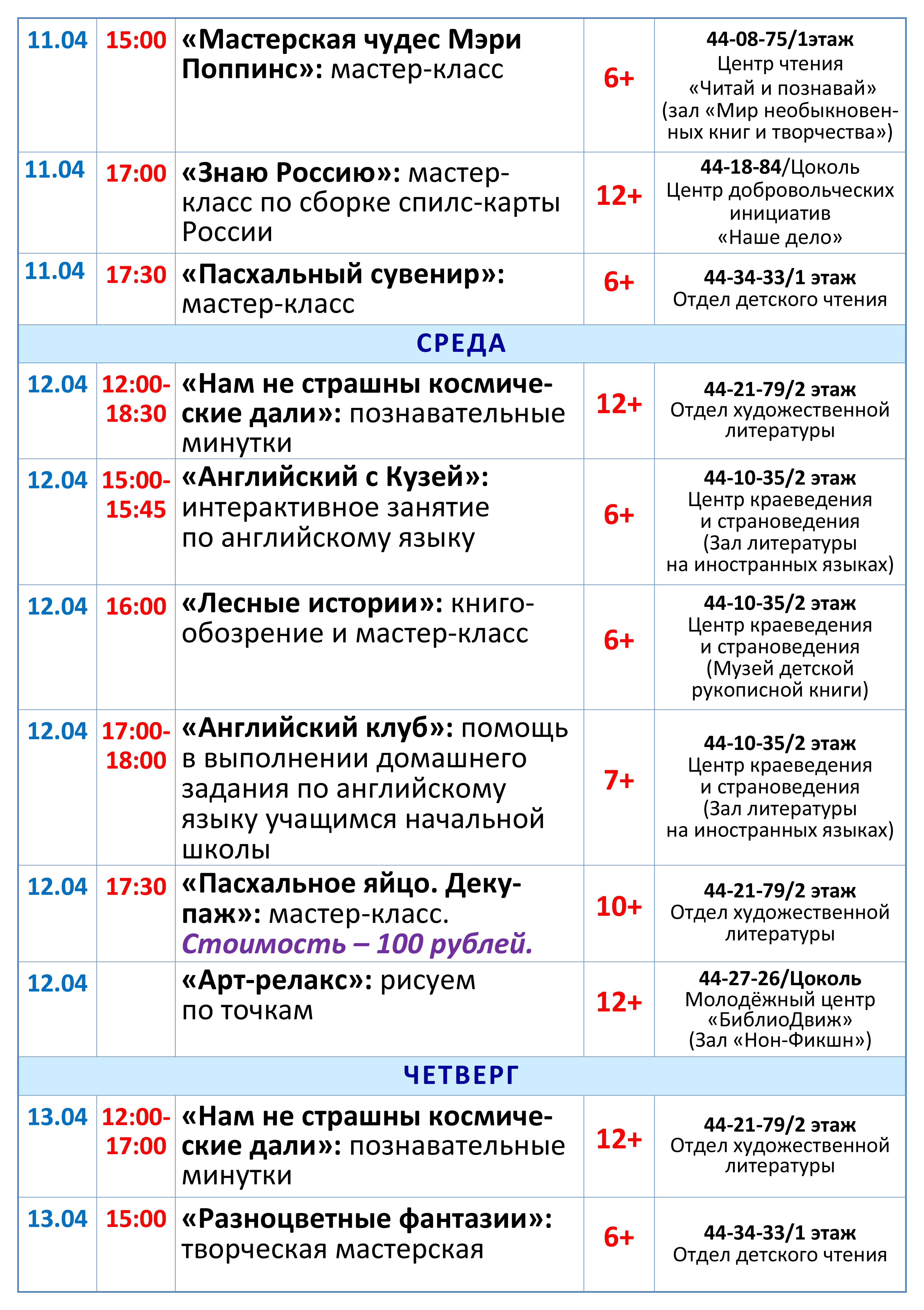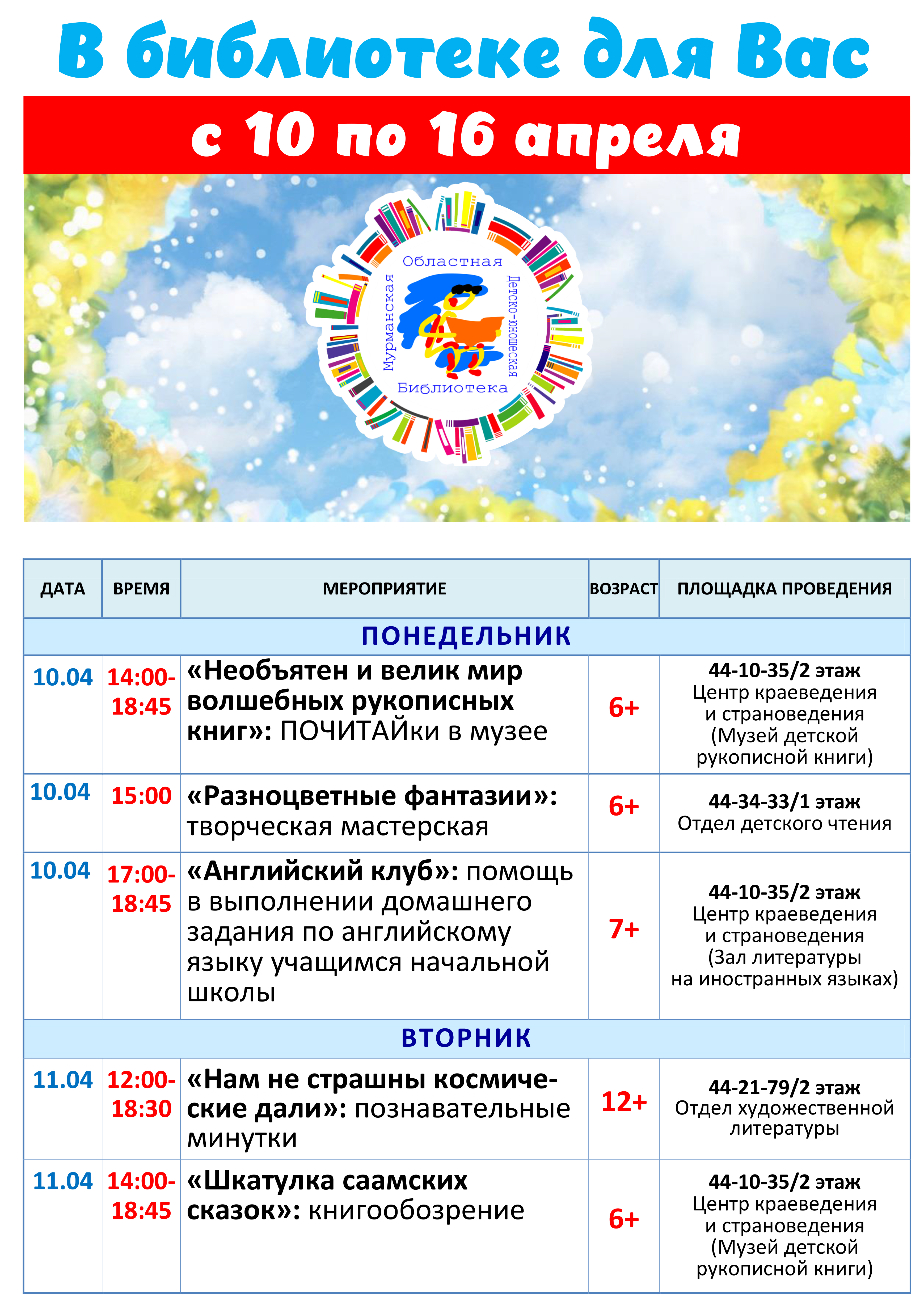 Уважаемые посетители, знакомьтесь с программой мероприятий, которые пройдут в библиотеке с 10 по 16 апреля