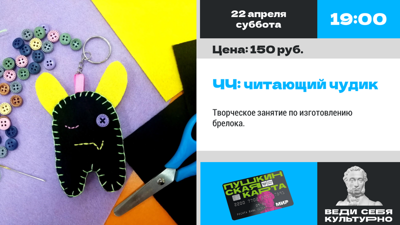 Поделка будет создана из фетра разной плотности с использованием ниток мулине и декоративных пуговиц. Участники под руководством библиотекаря смастерят удивительного персонажа, который станет украшением любой сумки, портфеля или других изделий. В ходе мероприятия каждый сочинит небольшую историю про своего читающего чудика, раскрыв его уникальность.