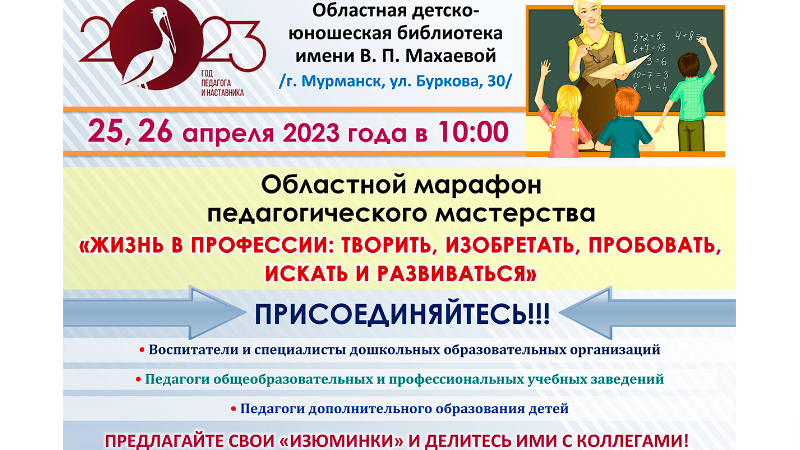 Для участников и гостей марафона пройдет слайд-шоу «Педагог: жизнь в профессии», и наши участники смогут вспомнить, каким видели образ педагога художники, скульпторы, артисты кино и увидеть себя в библиотеке на марафонах педагогического опыта. Кроме того, педагоги смогут поучаствовать в викторине «Поиграем в эрудитов?» и познакомиться с последними собственными изданиями Зала педагогического общения.