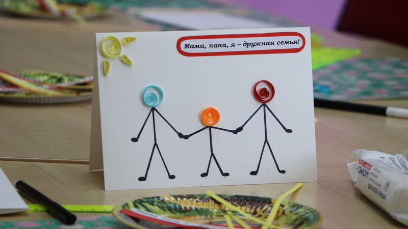Дети под руководством библиотекаря смастерили оригинальную поздравительную открытку в технике квиллинг и рисования. С особым усердием и старанием ребята сворачивали узенькие полоски бумаги в спиральки. Детей очень увлёк этот творческий процесс, кто-то справлялся самостоятельно, а кому-то по мере необходимости помогали. В результате у юных мастеров получились очень красивые, изящные открытки, на которых изображена семья: папа, мама и ребенок.