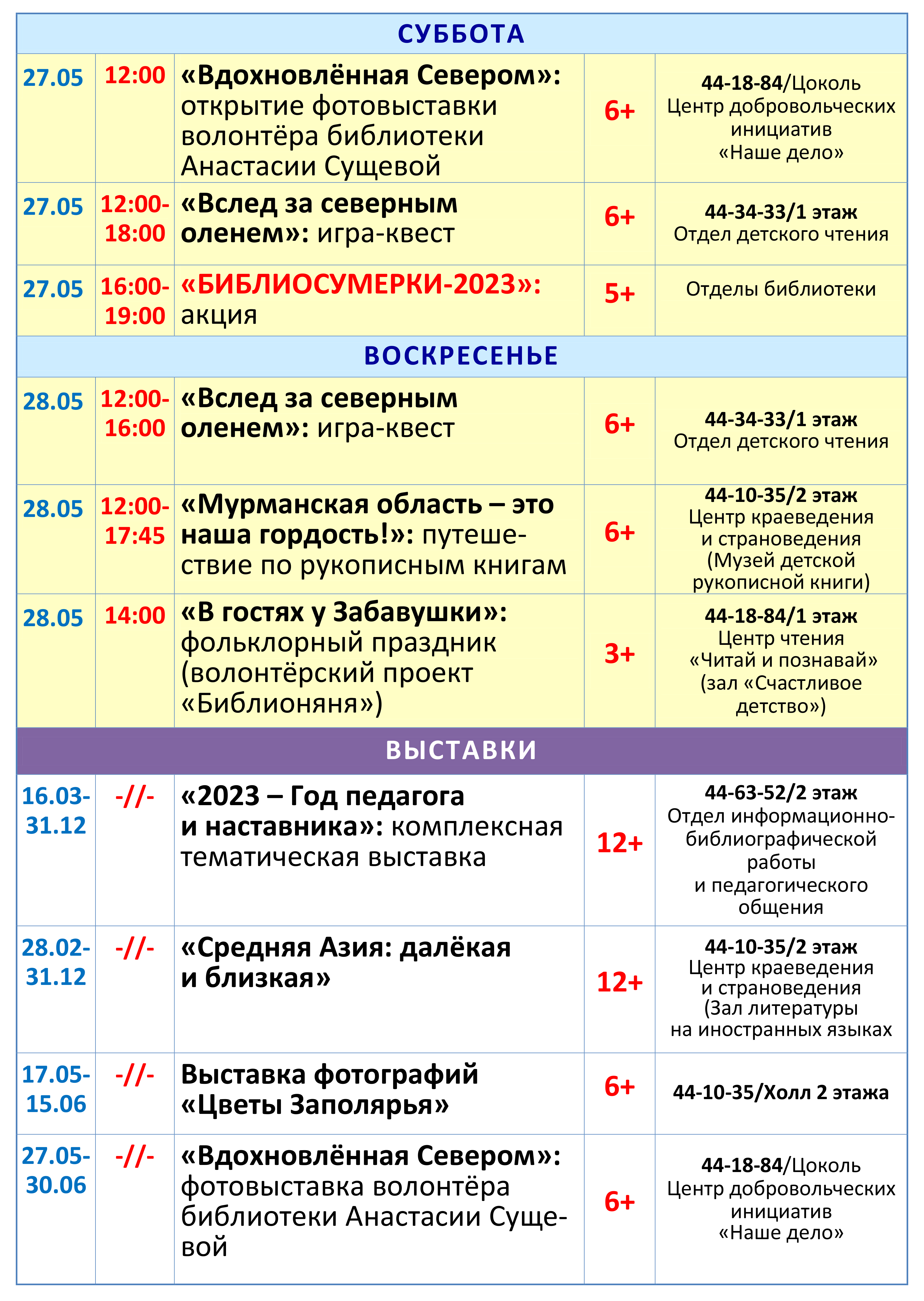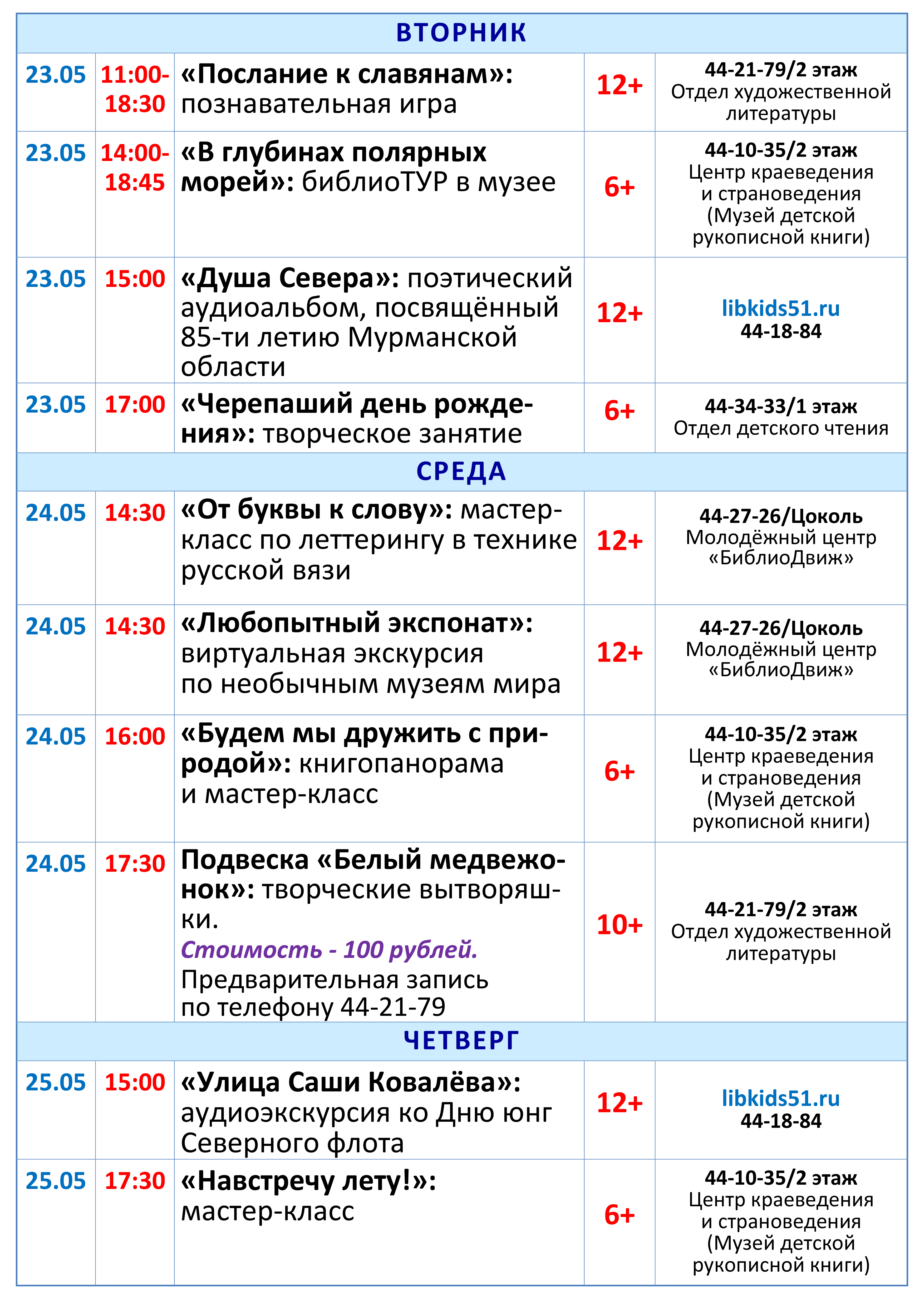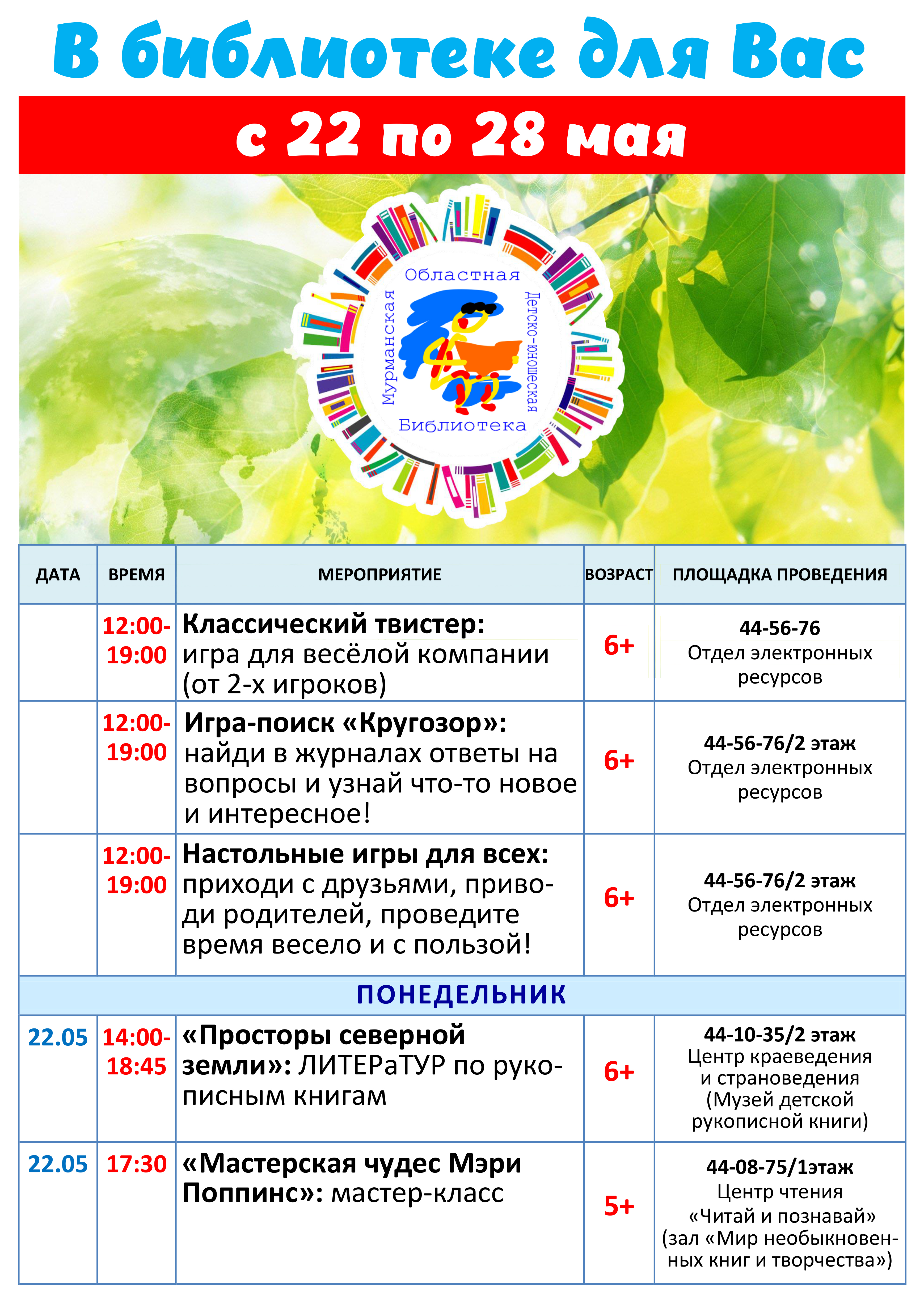 Уважаемые посетители, знакомьтесь с программой мероприятий, которые пройдут в библиотеке со 22 по 28 мая