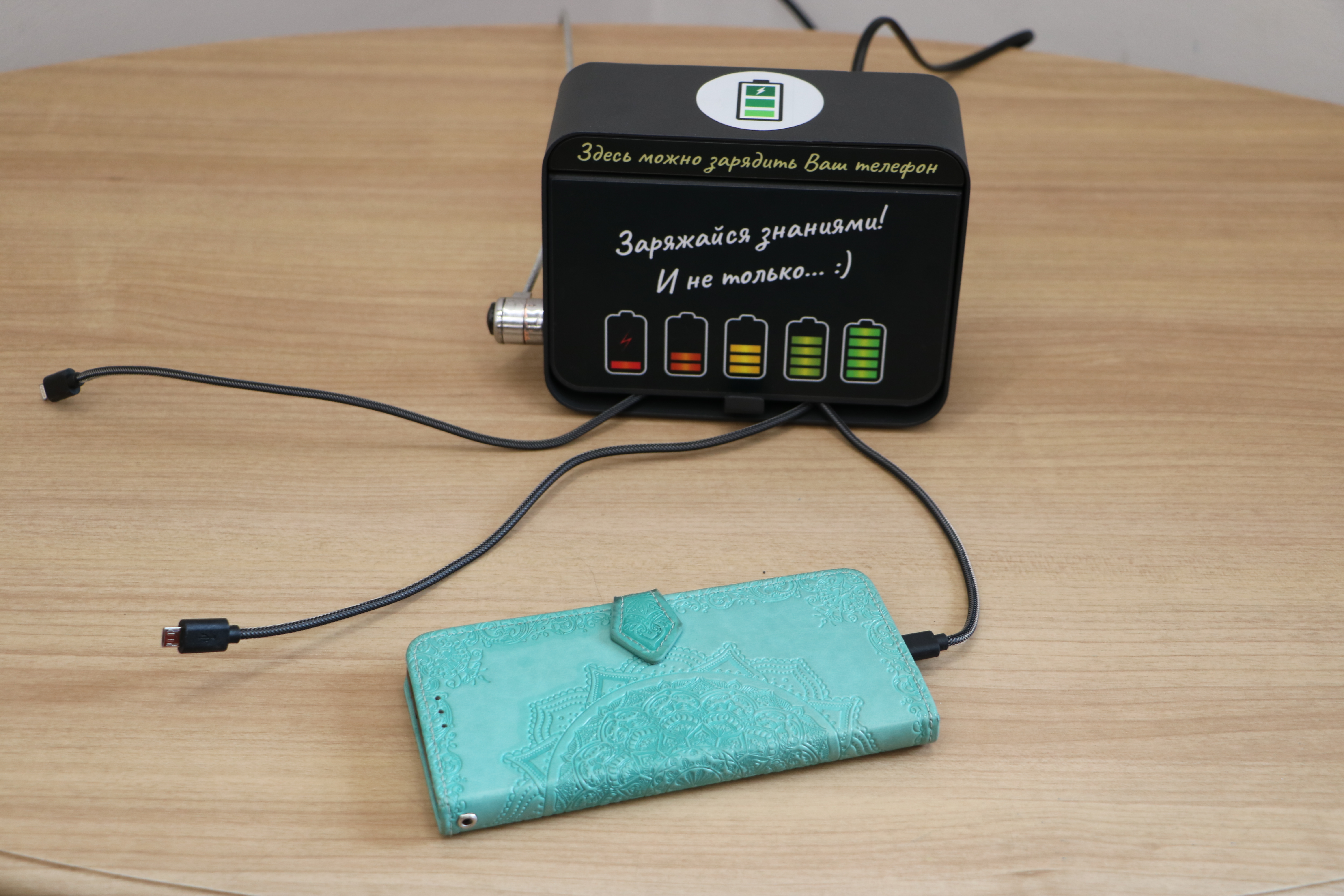 У читателей библиотеки появилась отличная возможность заряжать мобильные телефоны и планшеты. Портативное устройство расположено в холле первого этажа и дает возможность заряжать 5 устройств одновременно! Станция оснащена 4-мя встроенными кабелями + 1 беспроводная Qi зарядка в верхней панели.