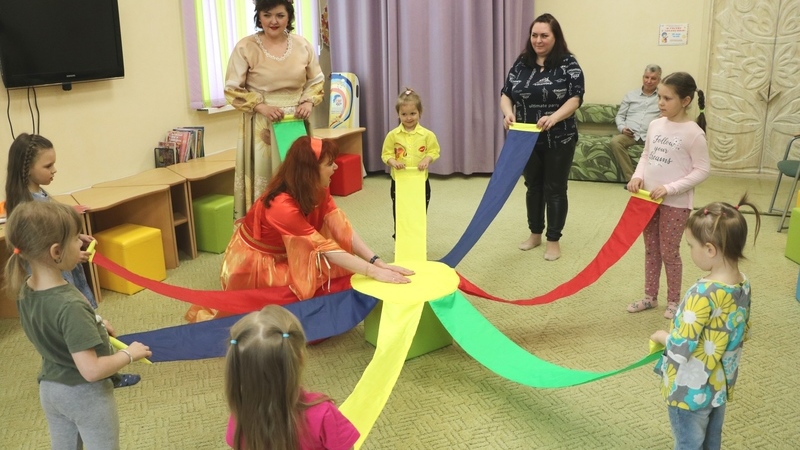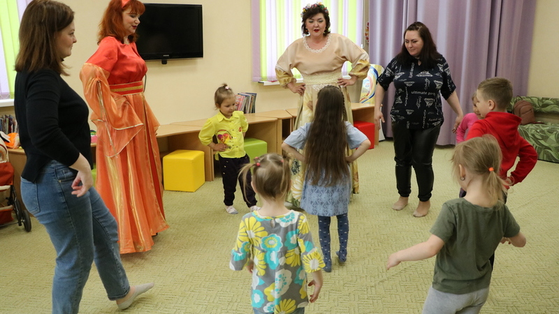 С воодушевлением ребята и их родители исполнили потешки и песенки, спели колыбельную, укачивая игрушки, водили хороводы и исполняли русские народные танцы. Много пели и играли, превращались в забавных зайчиков и воронов. А разноцветная карусель закружила детей и наполнила праздник радостным смехом и весельем.