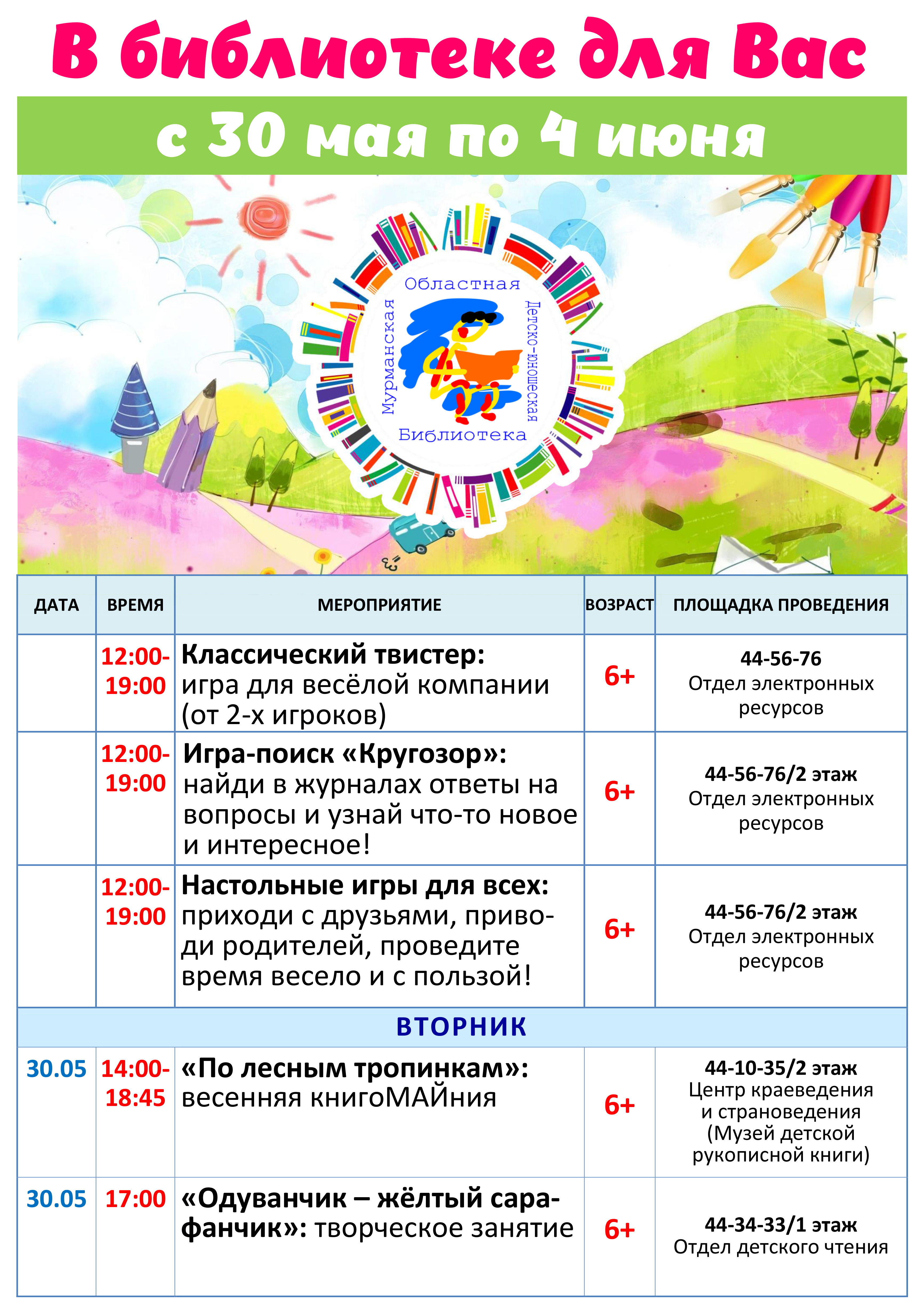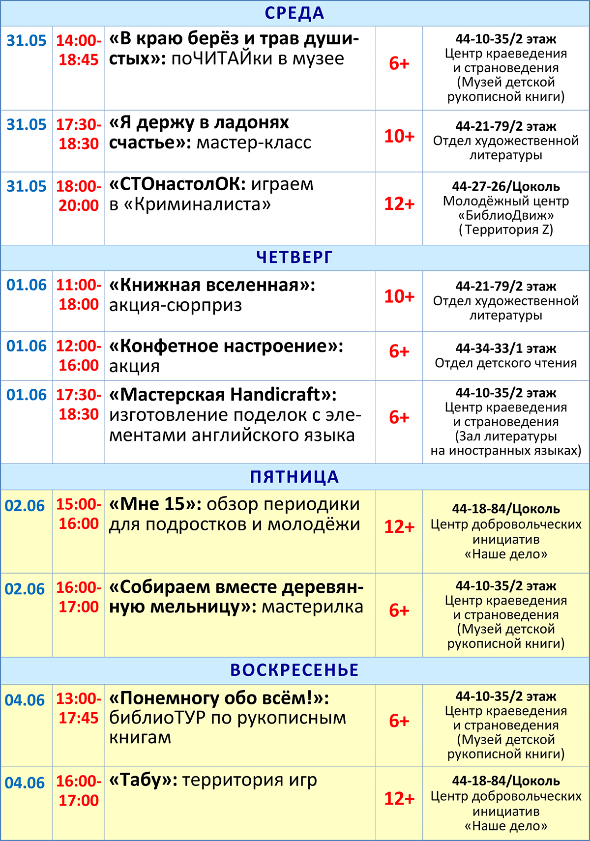 Уважаемые посетители, знакомьтесь с программой мероприятий, которые пройдут в библиотеке со 29 мая по 04 июня