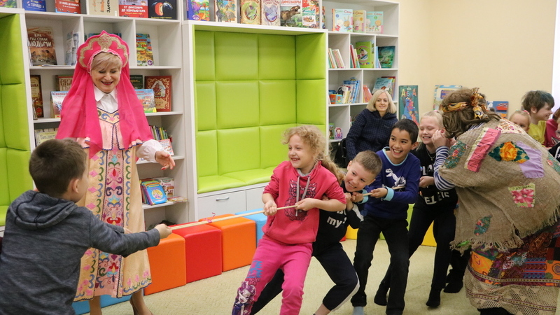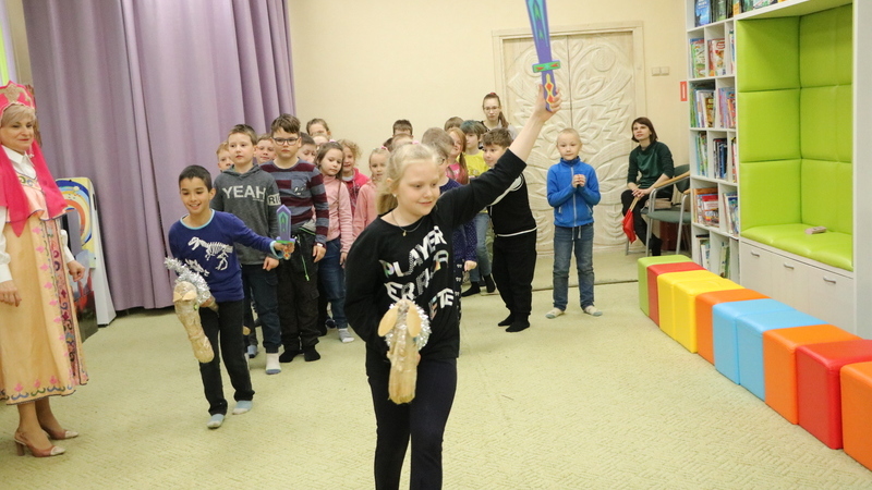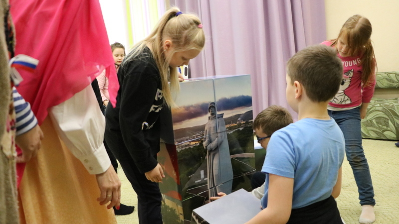 Ребята рассказали сказочным героиням о Мурманской области, складывали картинки с достопримечательностями из гигантских тематических кубиков.