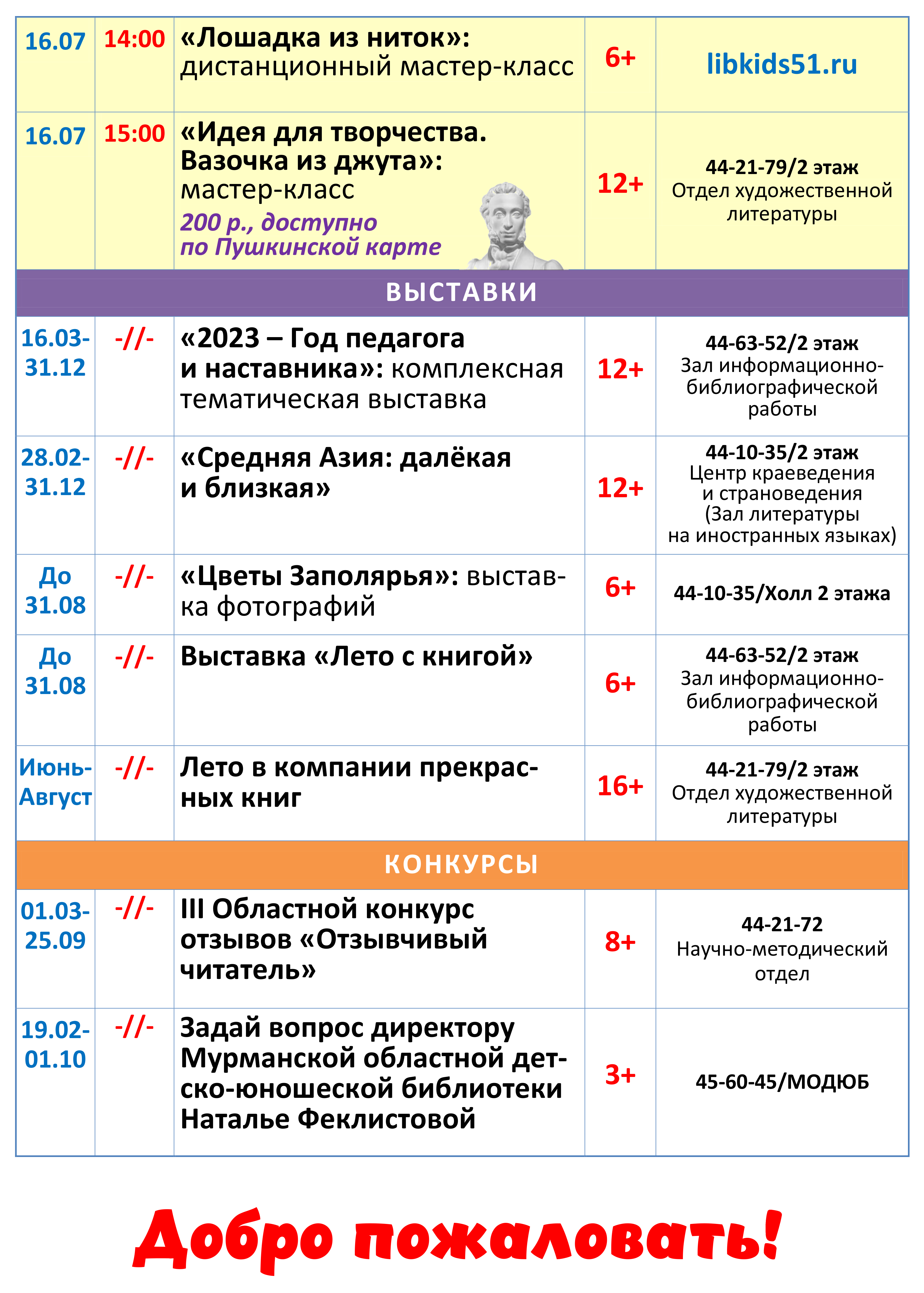 Мурманская областная детско-юношеская библиотека имени В. П. Махаевой приглашает читателей посетить интерактивные, познавательные и творческие занятия, игровые программы, книжные минутки, выставки, музеи, послушать обзор периодики, принять участие в разнообразных играх, увлекательных мастер-классах, акциях, конкурсах, расслабиться на занятии «Арт-релакс».
