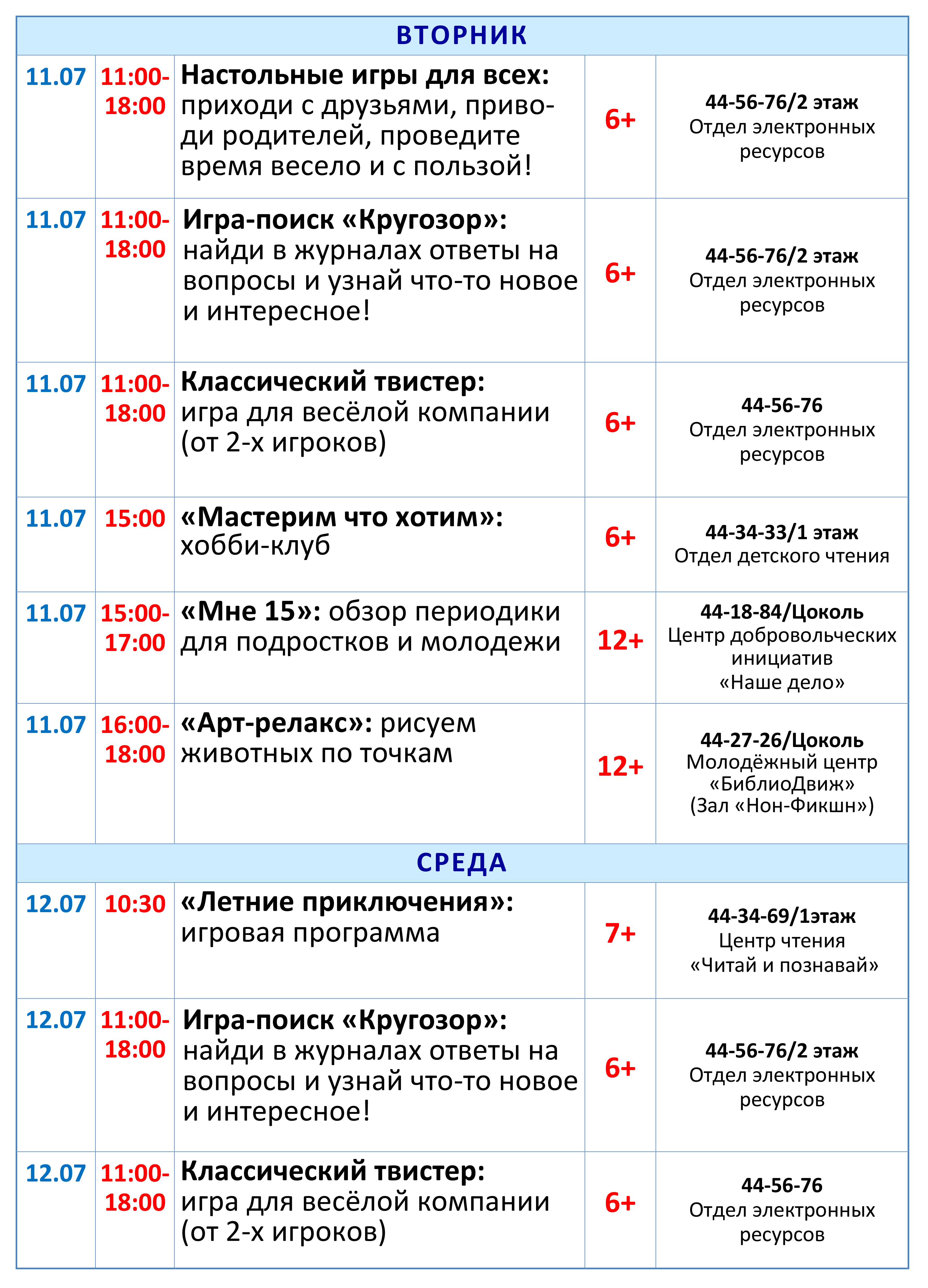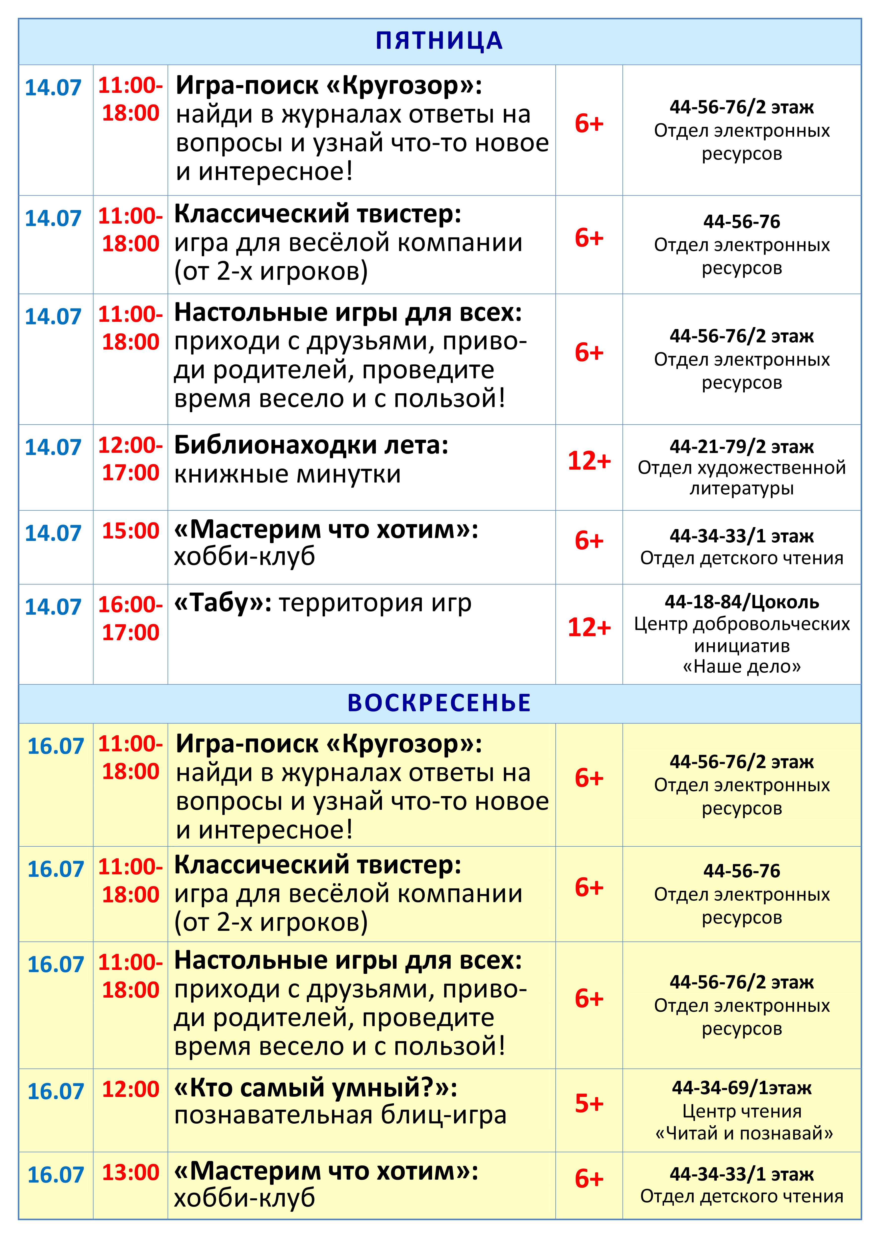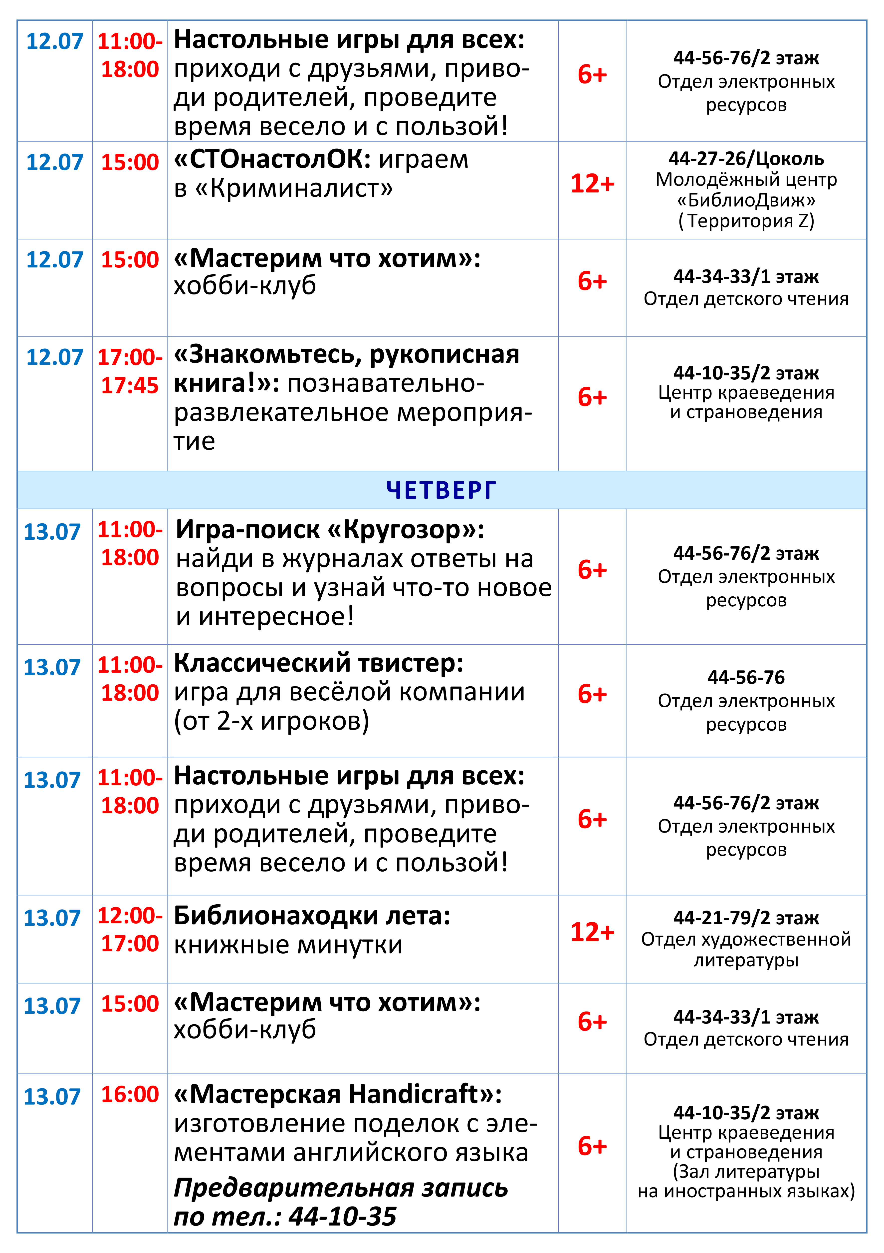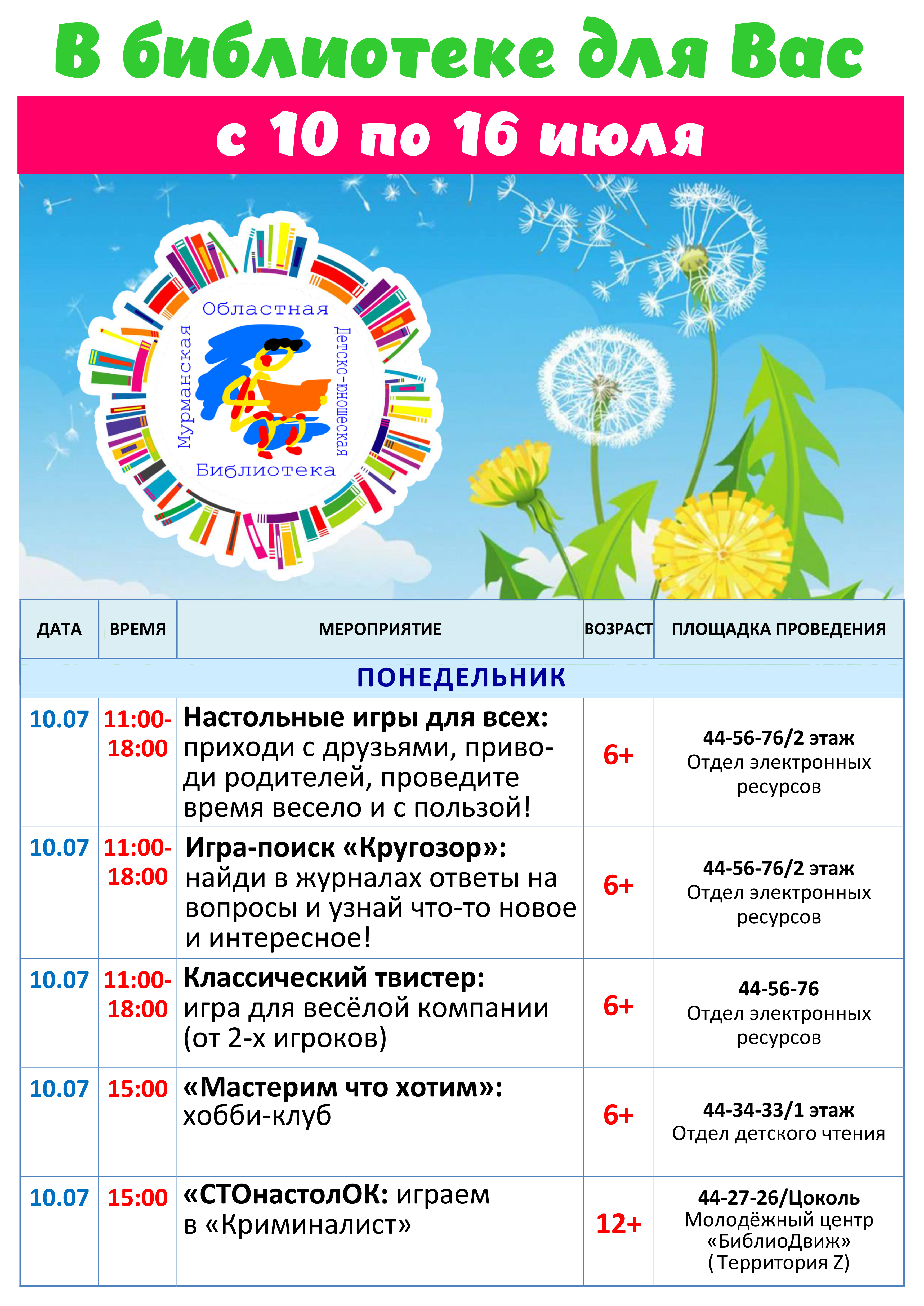 Всё лето в отделе детского чтения для юных мурманчан работает хобби-клуб «Мастерим что хотим», а в молодежном центре "БиблиоДвиж" игротека «СтонастолОК». Ежедневно в отделе электронных ресурсов мальчишек и девчонок ждут аэрохоккей, настольный футбол, дженга, дартс, конструкторы и еще много разнообразных настольных игр.